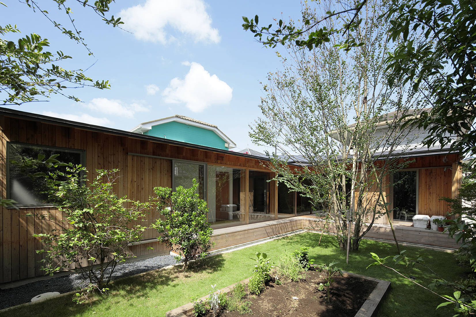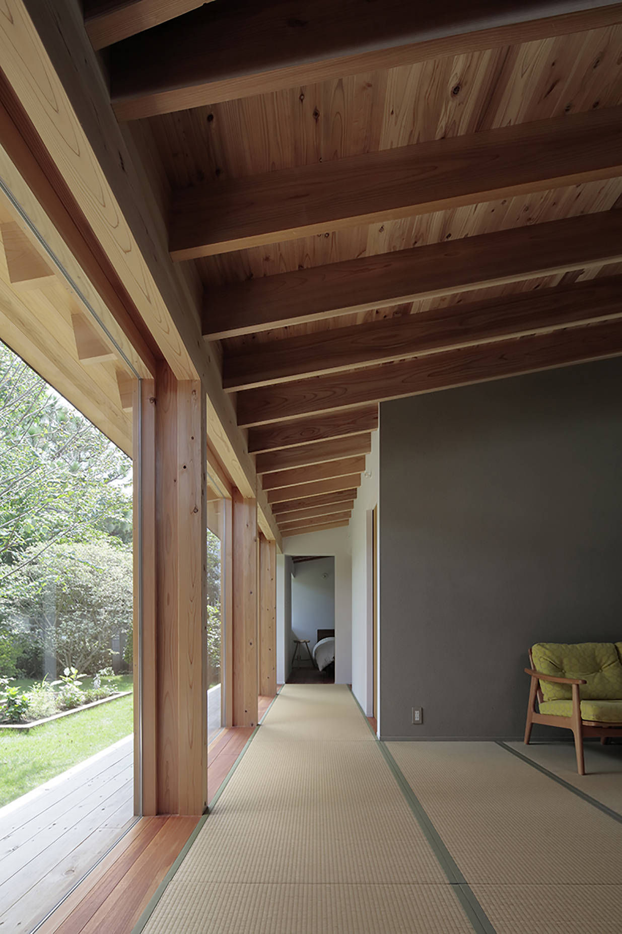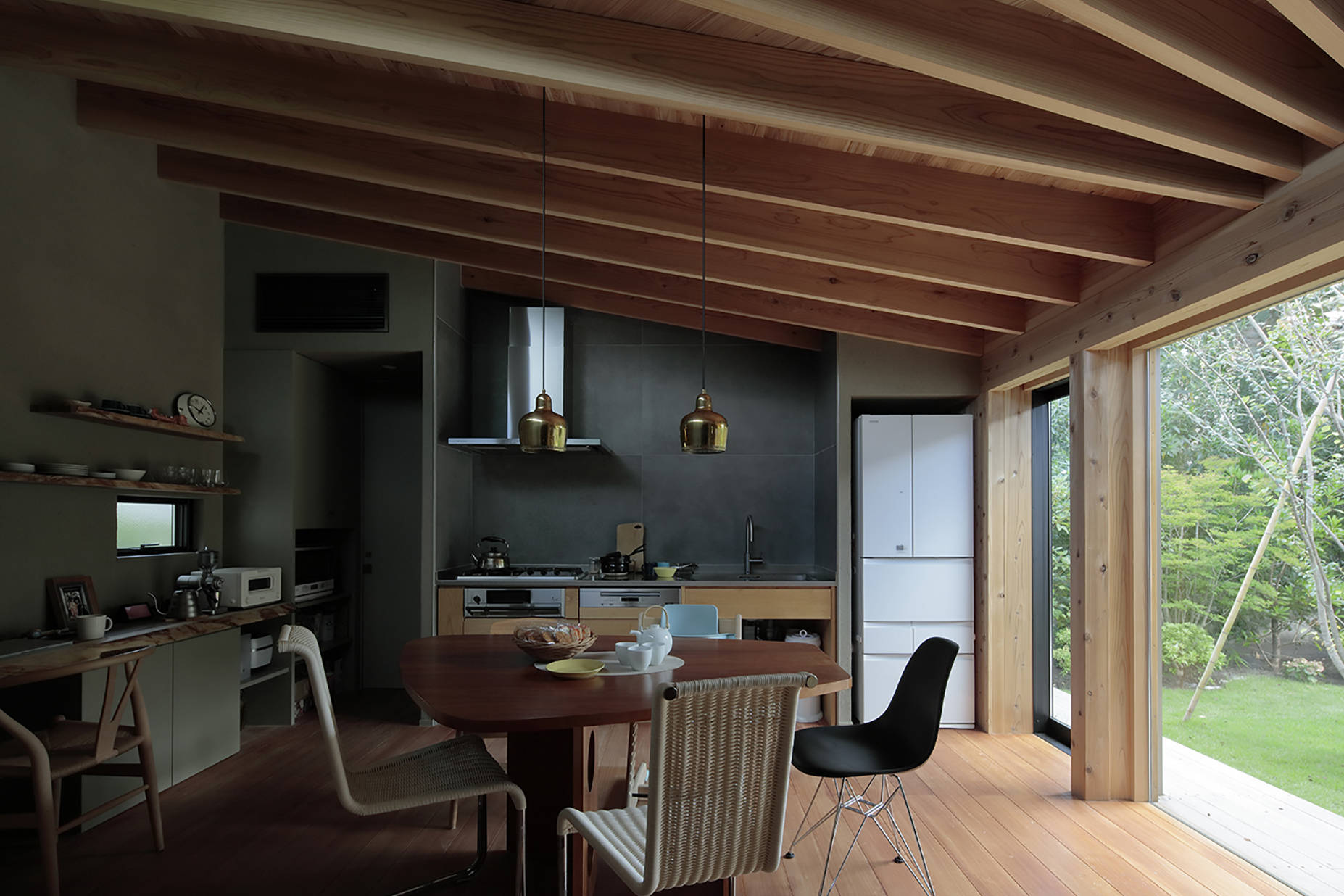 旗竿敷地の奥に庭を取り囲むようにL字型の住宅を配置しました。一部45度に切り欠かれたL字型平面に対して垂木を掛ける事で扇を描くように垂木が配置されており、寝室からリビング、ダイニングとおおらかに囲われた空間となりました。床は蜜蝋柿渋を塗った桐フローリングと畳の廊下、壁面は粗めのテクスチャの左官壁、天井は杉垂木など自然素材を中心としていますが、栗材を面材に用いたステンレスオーダーキッチン、キッチン正面に大版の磁器質タイル、大開口のガラス面、銅材を用いた抑え金物やSAVOY仕様アルヴァ・アアルトのGOLDEN BELLなど工業的なマテリアルも適度に配置しインテリアのバランスを取っています。緑が豊かな庭が室内に連続する住宅となりました。
