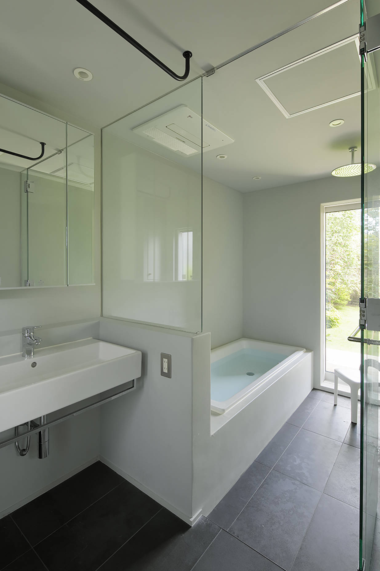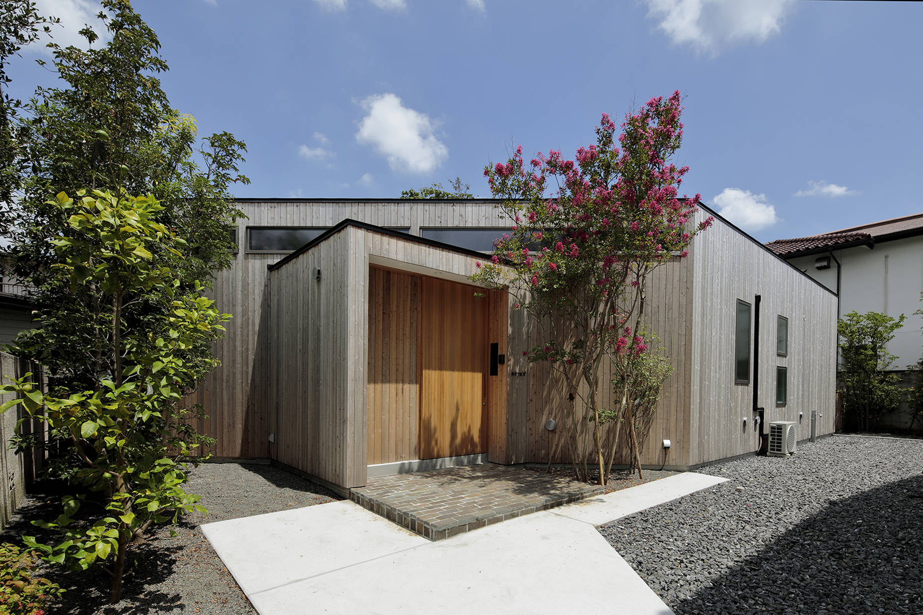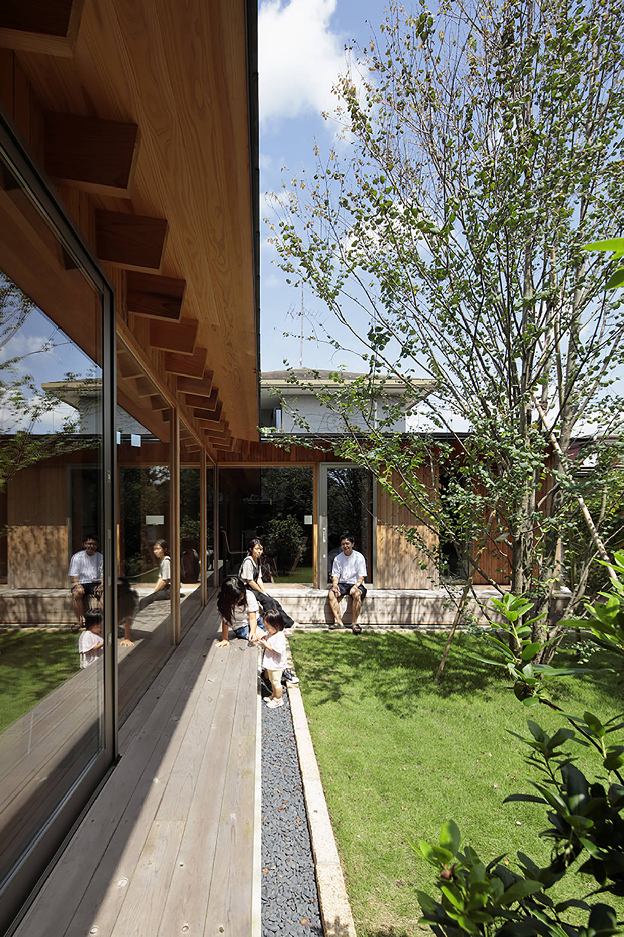 旗竿敷地の奥に庭を取り囲むようにL字型の住宅を配置しました。一部45度に切り欠かれたL字型平面に対して垂木を掛ける事で扇を描くように垂木が配置されており、寝室からリビング、ダイニングとおおらかに囲われた空間となりました。床は蜜蝋柿渋を塗った桐フローリングと畳の廊下、壁面は粗めのテクスチャの左官壁、天井は杉垂木など自然素材を中心としていますが、栗材を面材に用いたステンレスオーダーキッチン、キッチン正面に大版の磁器質タイル、大開口のガラス面、銅材を用いた抑え金物やSAVOY仕様アルヴァ・アアルトのGOLDEN BELLなど工業的なマテリアルも適度に配置しインテリアのバランスを取っています。緑が豊かな庭が室内に連続する住宅となりました。