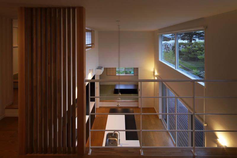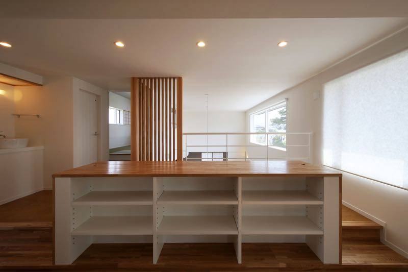 スタディーコーナーは、家族で利用できるように、2階の動線の中心に配置し、吹抜けに面しているので、1階と2階にいる家族がお互いのコミュニケーションを取る場にもなっています。