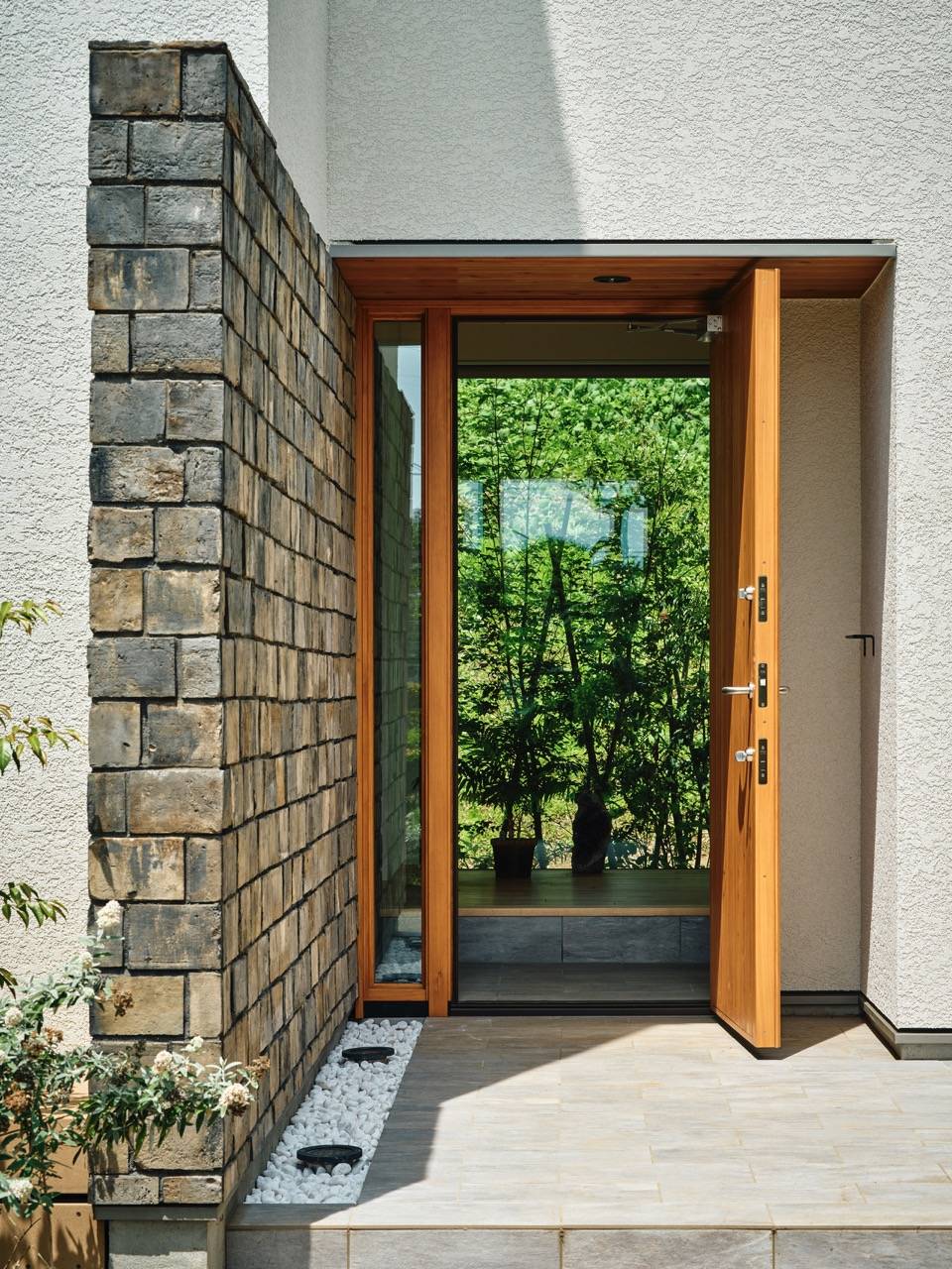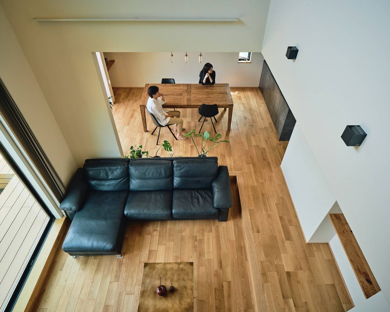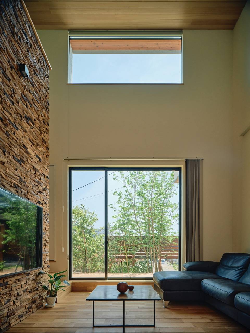 住宅地の奥にあり、さらに長いアプローチを持つため、オープンでありながらプライベート感のある室内環境を望まれました。吹抜けや背面の山への抜けなど開放性を持たせることが可能でした。