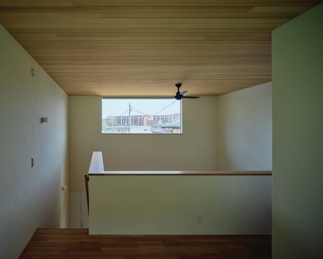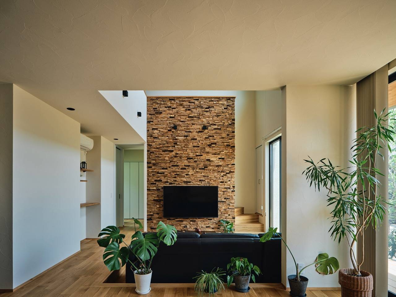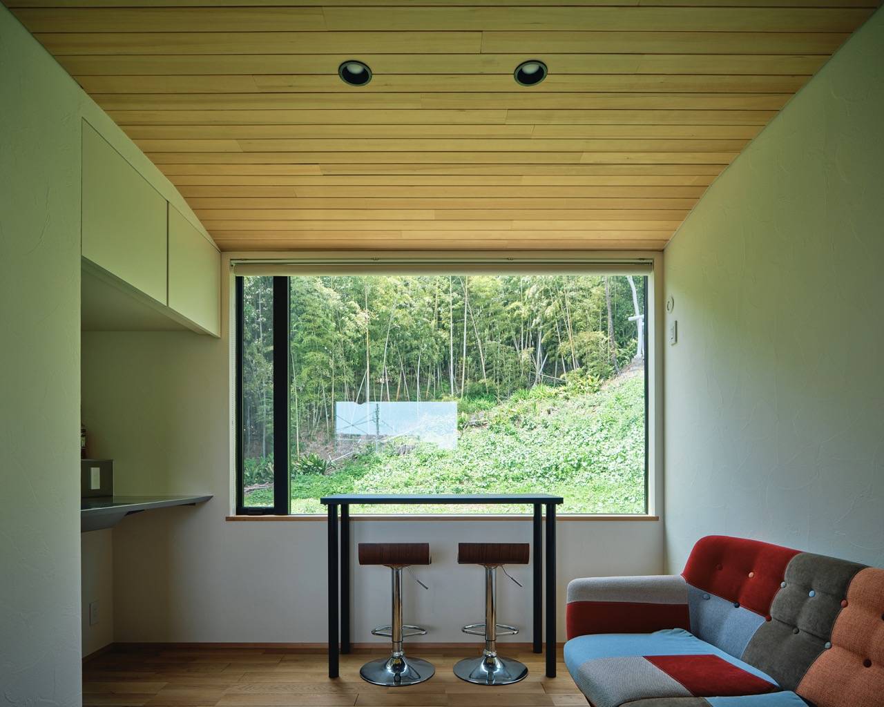 アプローチを進み、外部空間から連続する壁が内部まで続き、その先に背面の山の緑が開けます。玄関の吹抜け空間から入口をくぐった先にはLDKの一室空間。一段下がったリビングにはフランス製のお気に入りのソファーが配され、対面には壁掛けTVを有するウッドブロックの壁が立ち上がります。その裏の階段を登り切ると2階バースペース。ここには裏山を見渡せる大開口と、吹抜けを介して遠景が広がる大開口があります。ホテルライクな水回りを実現し、個室は巣篭り感を大切にしています。