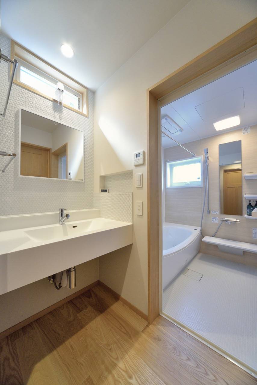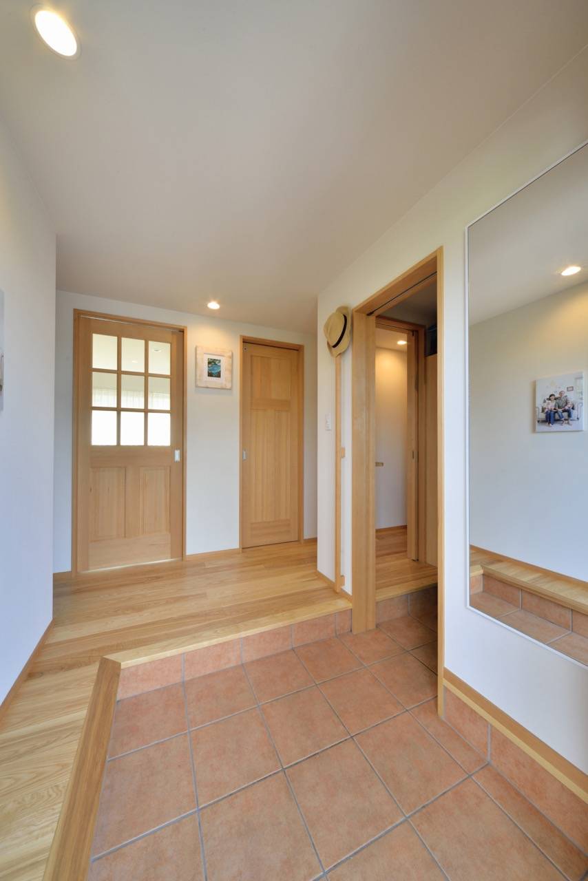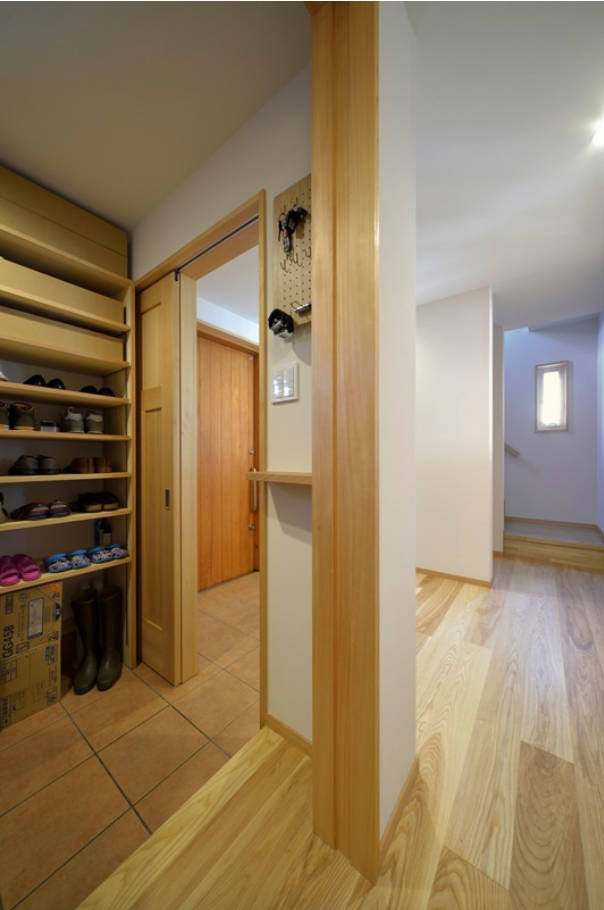 平日は忙しくされるご主人の希望は、帰宅すると玄関から洗面所にいき、それからクローゼットで着替えてから家族の待つLDKにいくというルーティーンの実現でした。何度かの打合せを重ね、広い玄関ホールにウォークインクローゼットと土間収納を配置し、LDKを通らずに洗面室に抜ける構成に絞られていきました。最終的にはウォークインクローゼットを中心し、リビング、ダイング、キッチン、パントリー、洗面室、玄関ホール、リビングと回遊するプランとなりました。