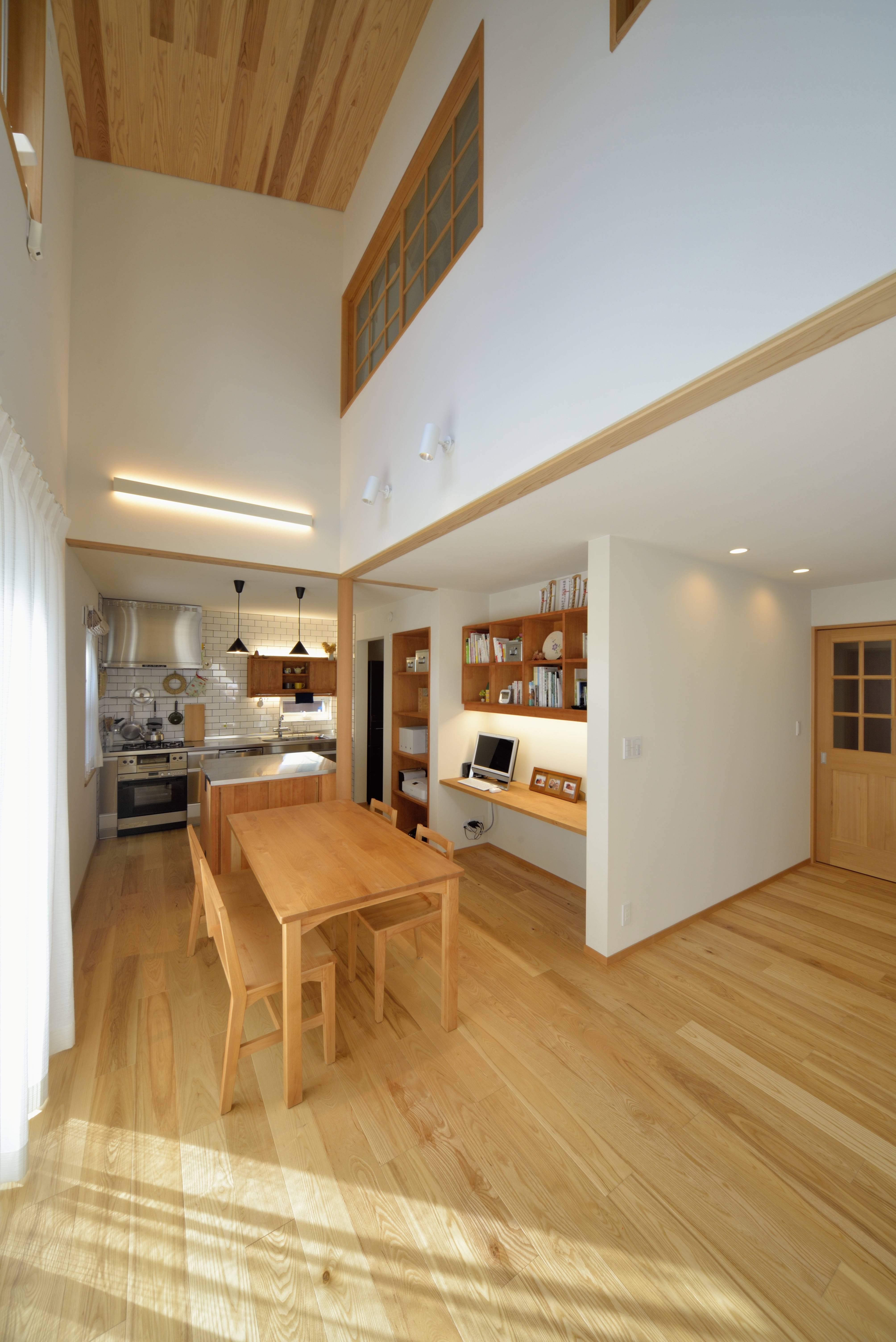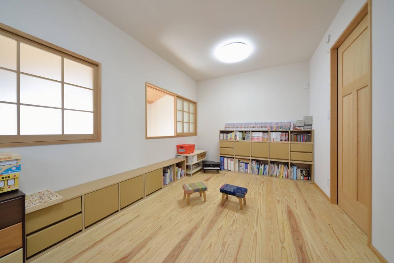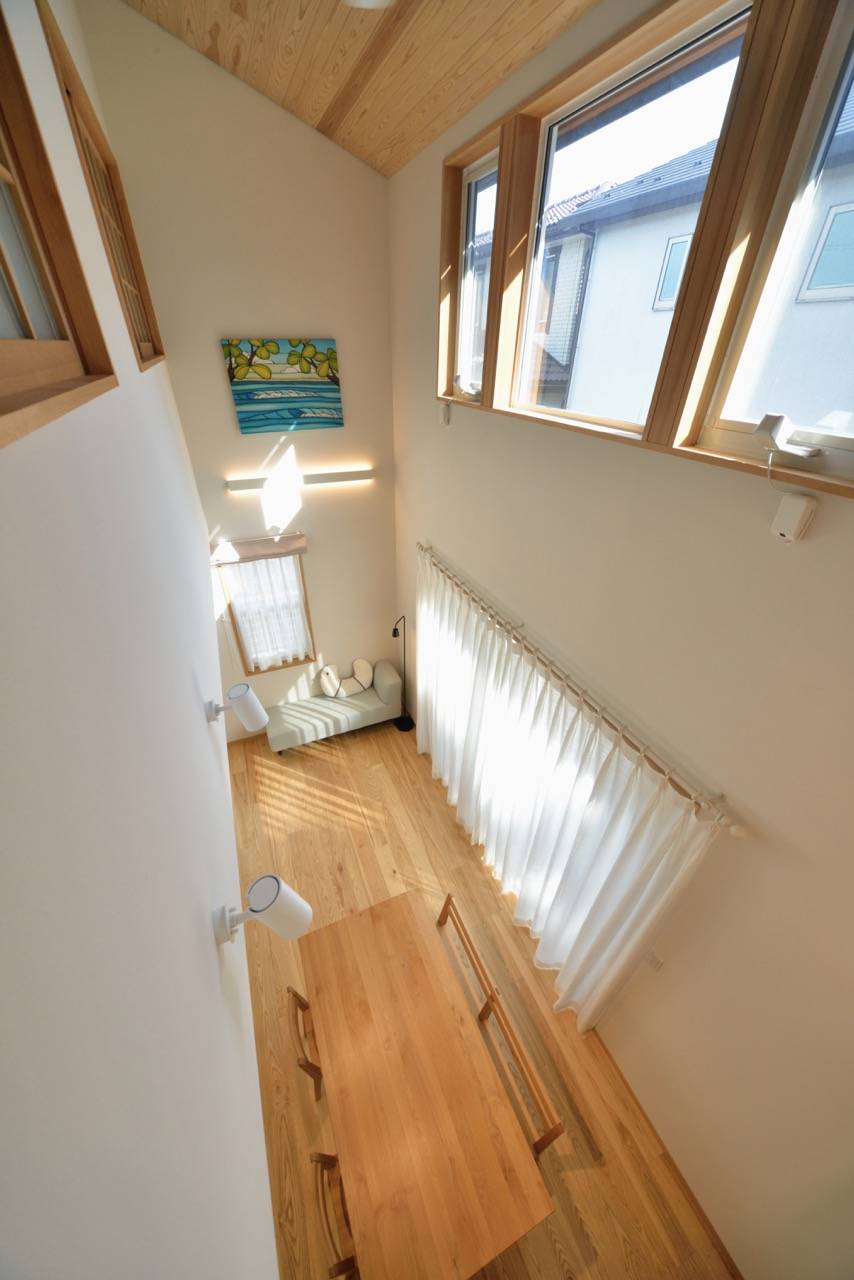 回遊だけではなく開放感を得るためにリビングは吹き抜けており、2階子供室がそこに面しています。