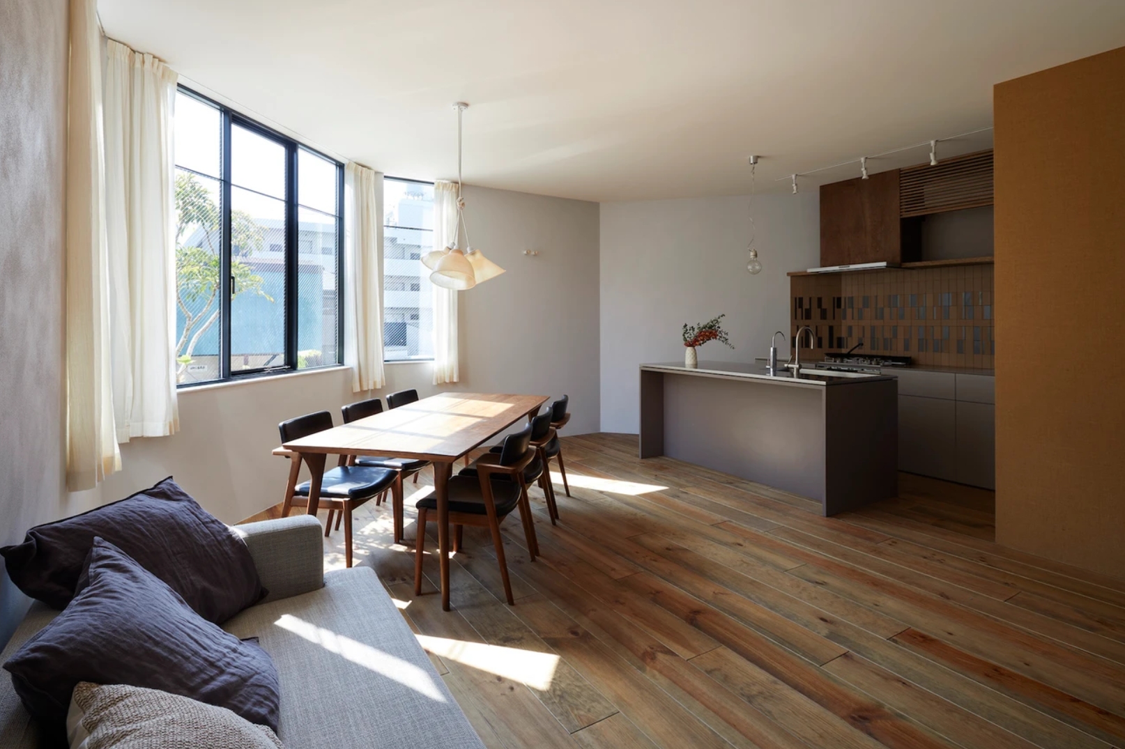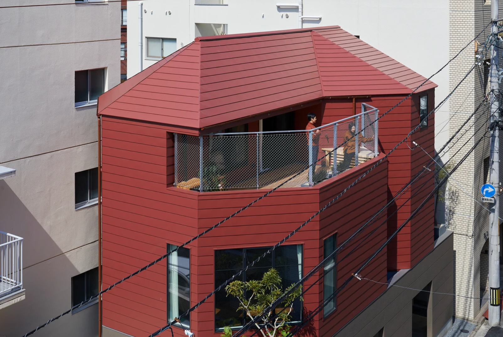 愛媛県の街中の住宅です。周囲を高層ビルに囲まれているため、窓先空間を確保して光や風を取り込める変形八角形の平面で構成しています。