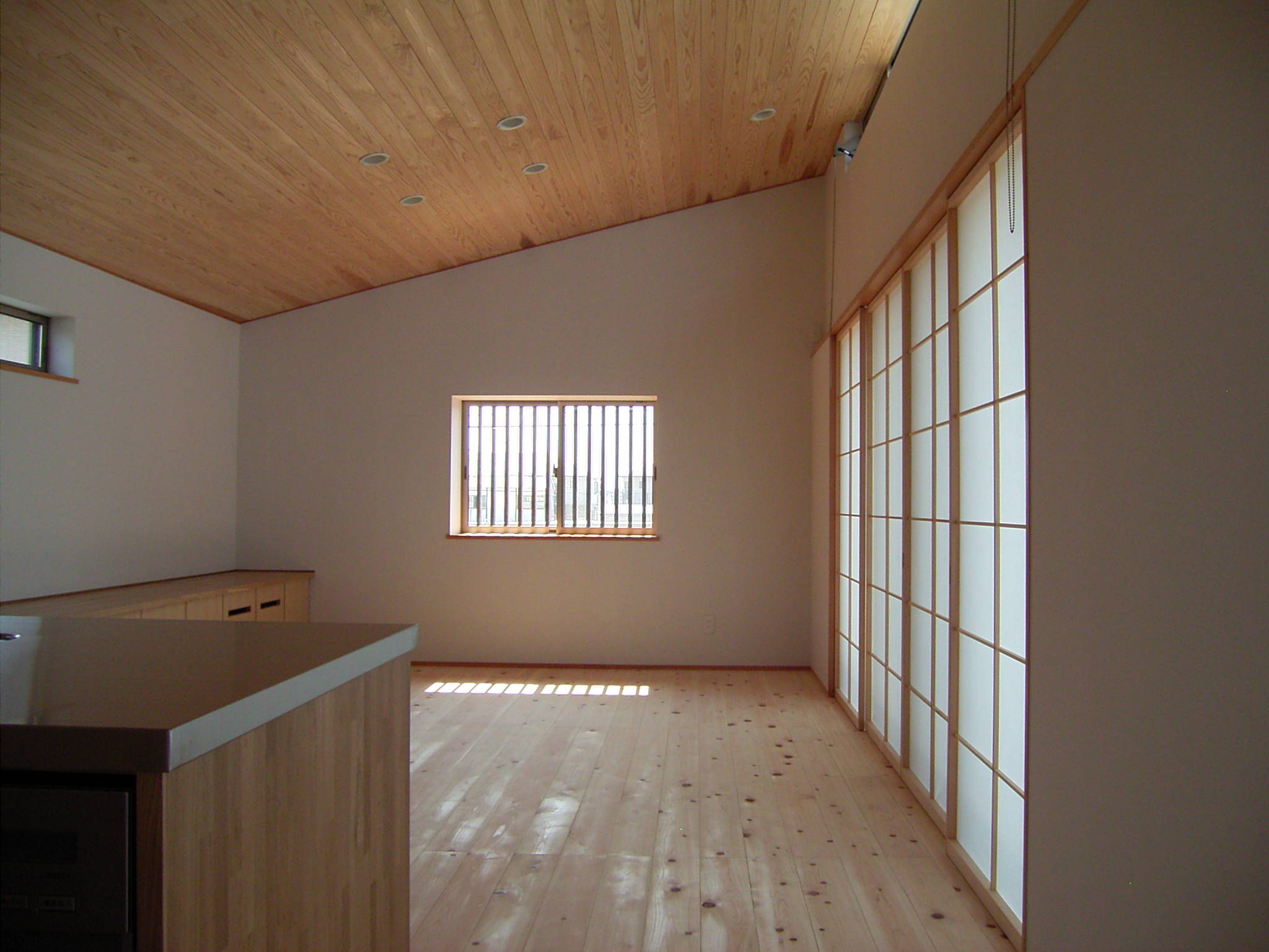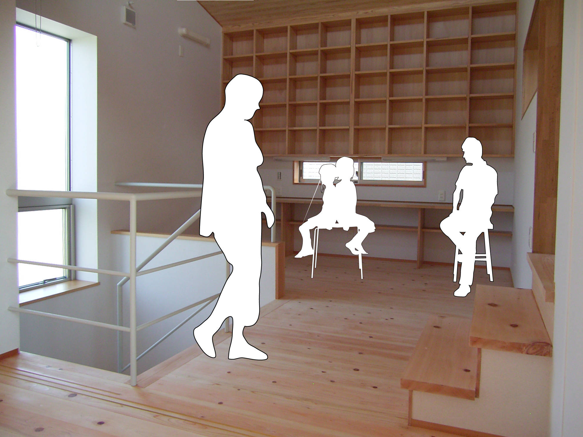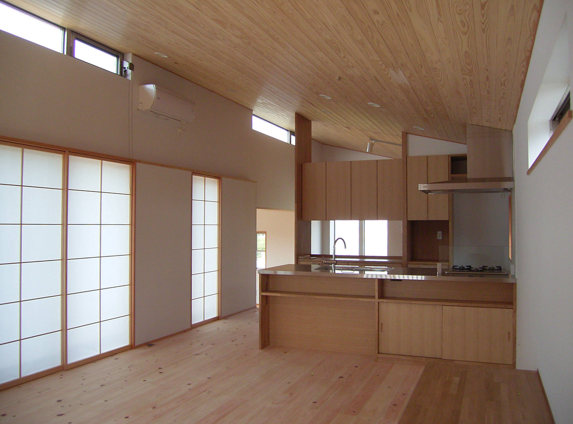 造成地内の敷地は東接道で、南東側に視界がぬけます。ここに仲の良い若い家族のための木造2階建て住宅を計画しました。近隣との関係や日照を考慮しL字型の住棟配置とし、ひとつの大空間をゆるく区切り、思い思いにとどまる事が出来る場をもつ家としています。 1階には主寝室と水回り、工作室があります。コンクリート土間の工作室は、庭から直接出入りできます。ここにはシンクを備え付ており、子供の工作や、妻のガーデニング、夫の自転車の手入れなど、多様に使うことを想定しました。階段をのぼり居間へ至る道行きには家族室があります。ここは3枚引きの間仕切りを開けると子供室と一体となり、60cmの床レベル差で居間とも緩やかに繋がっています。最高天井高は3.8mで北側壁面に本棚とカウンターテーブルを造付け、横長の細長い窓を採ることにより、落ちついた学習スペースとしました。2階のオープンキッチンからは、居間や家族室、子供室、また庭の様子を知ることが出来ます。お料理好きの家族のためのもうひとつの生活の場となっています。
