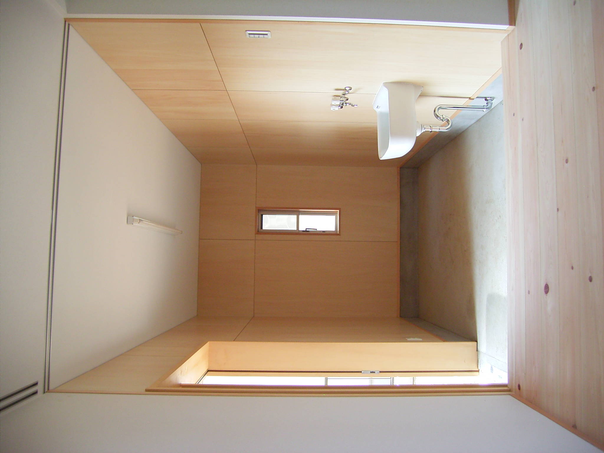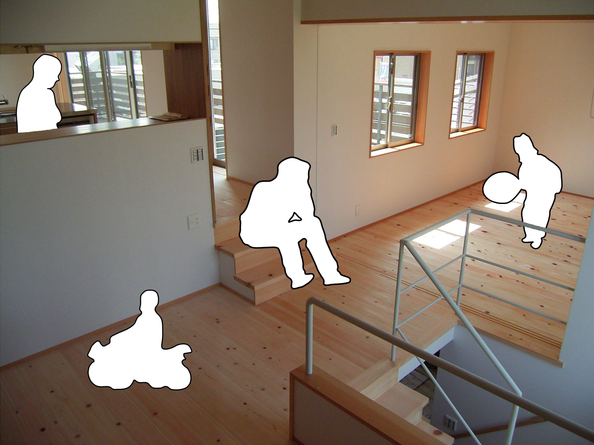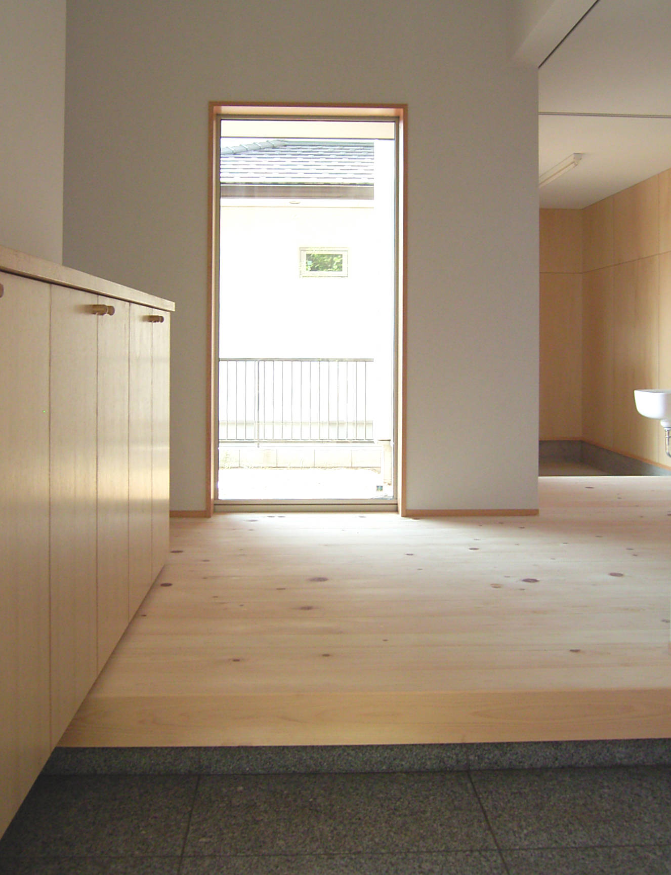 造成地内の敷地は東接道で、南東側に視界がぬけます。ここに仲の良い若い家族のための木造2階建て住宅を計画しました。近隣との関係や日照を考慮しL字型の住棟配置とし、ひとつの大空間をゆるく区切り、思い思いにとどまる事が出来る場をもつ家としています。 1階には主寝室と水回り、工作室があります。コンクリート土間の工作室は、庭から直接出入りできます。ここにはシンクを備え付ており、子供の工作や、妻のガーデニング、夫の自転車の手入れなど、多様に使うことを想定しました。階段をのぼり居間へ至る道行きには家族室があります。ここは3枚引きの間仕切りを開けると子供室と一体となり、60cmの床レベル差で居間とも緩やかに繋がっています。最高天井高は3.8mで北側壁面に本棚とカウンターテーブルを造付け、横長の細長い窓を採ることにより、落ちついた学習スペースとしました。2階のオープンキッチンからは、居間や家族室、子供室、また庭の様子を知ることが出来ます。お料理好きの家族のためのもうひとつの生活の場となっています。