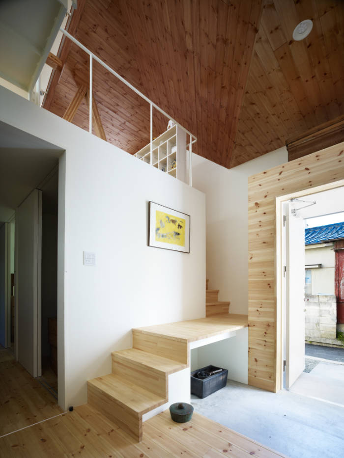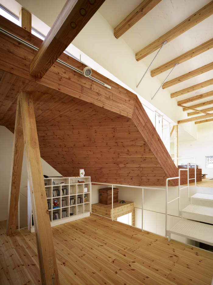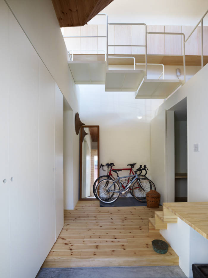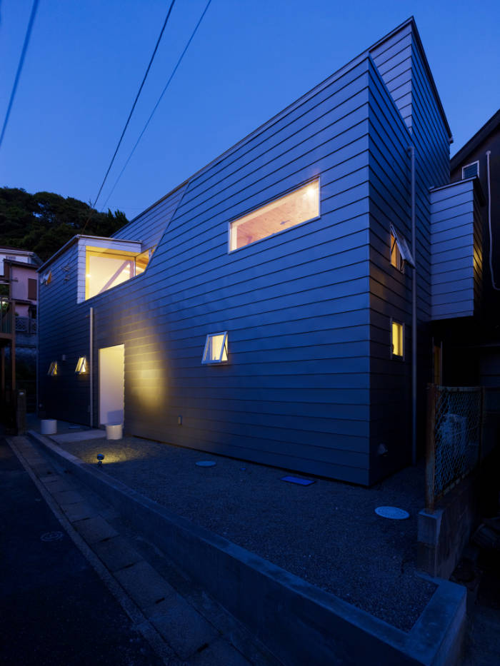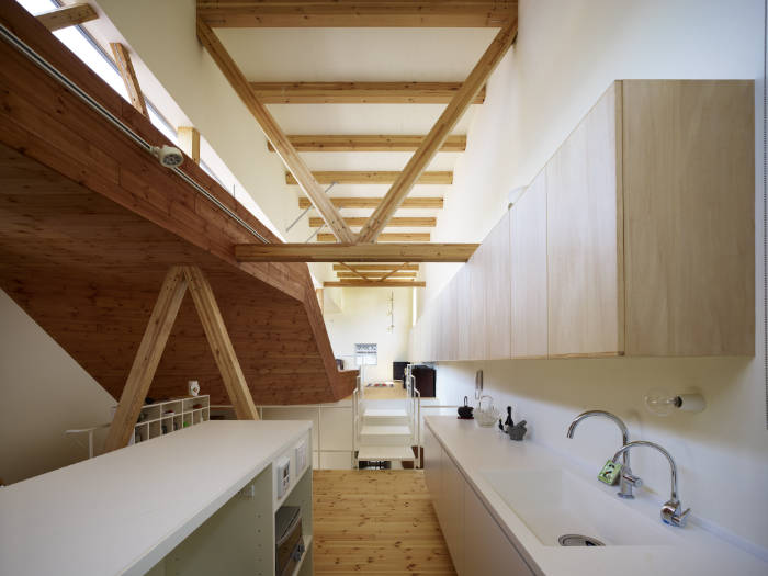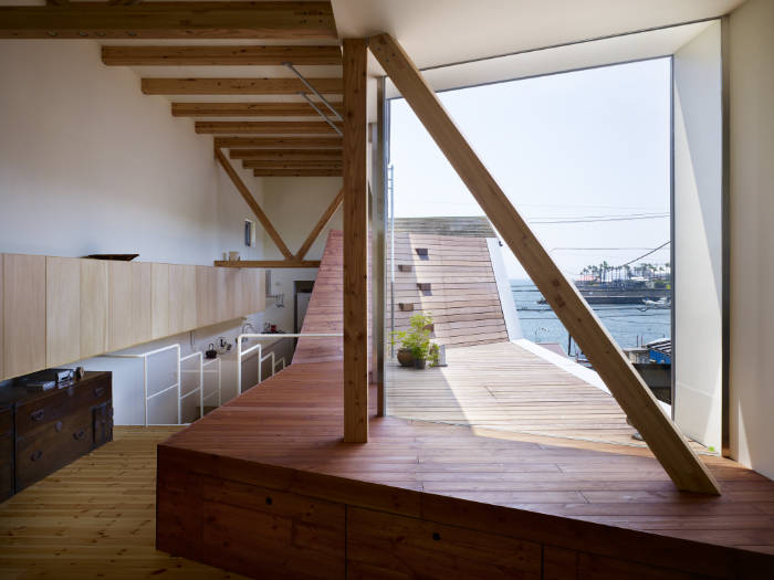 段丘に沿った細い路地を登り、振り返ると海への視界が開ける。そうした漁村の生活動線を室内にも延長して構成されたリビングスペースです。玄関上部から食堂に連なる船底天井は、敷地最奥の居間に向かって縁台となり、さらにその上面が甲板として外部に連続します。その舳先は、細い路地から、海へと視線を返す屋根になっており、一体の空間に様々な場を生み出しています。