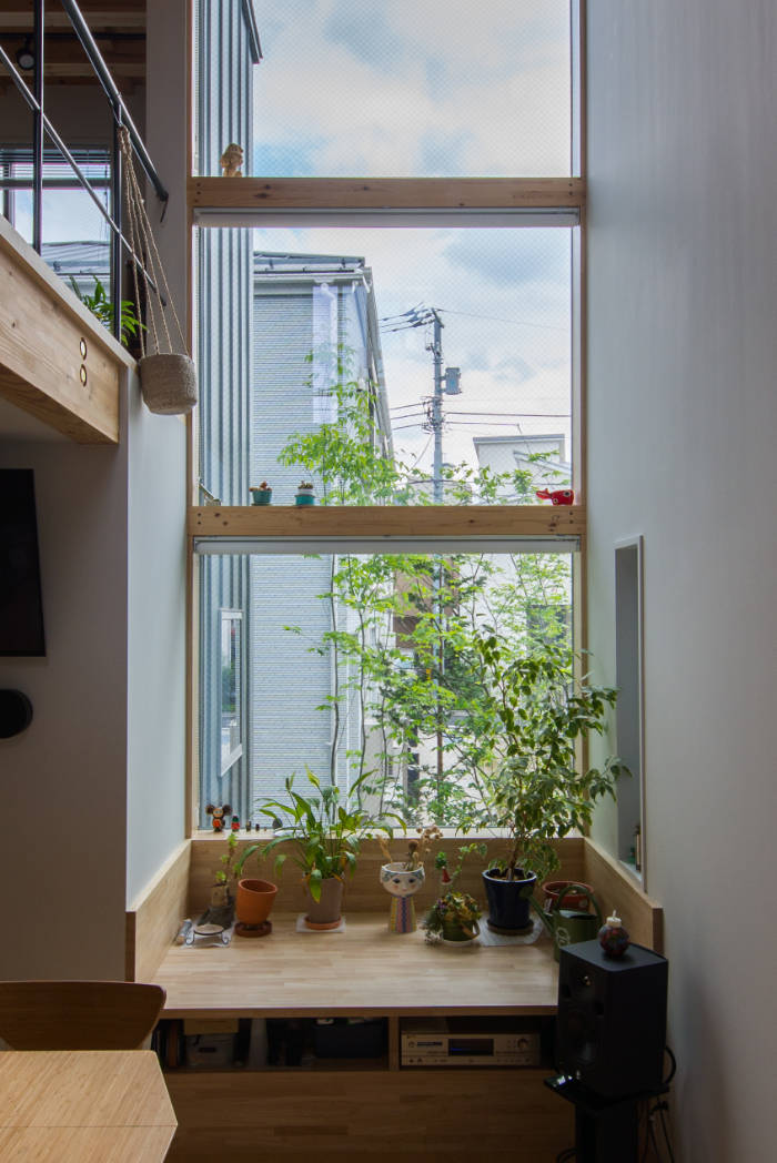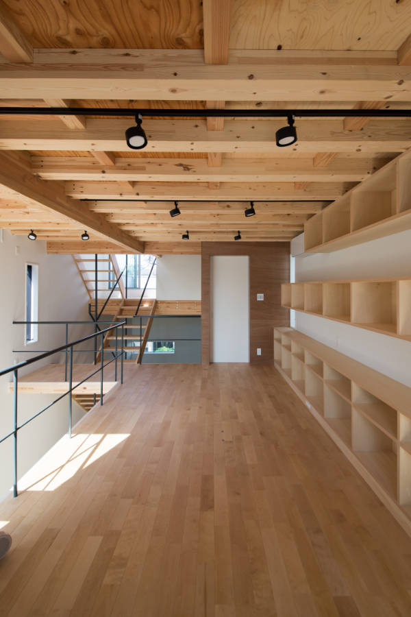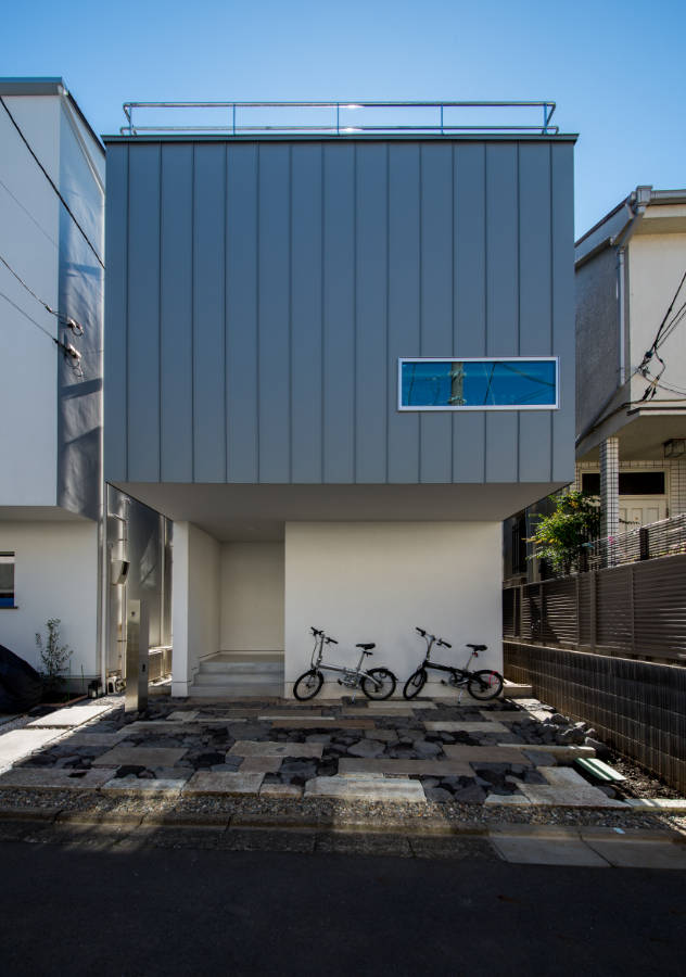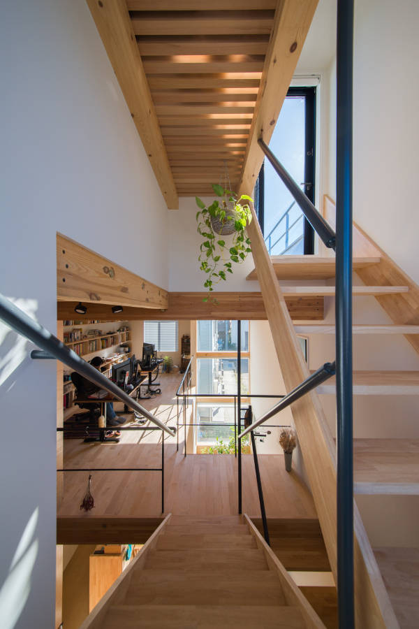 半層下がった地下スペースから7つのレベルにスキップする家。仕事場へのアクセスを重視した土地選びを経て、完全リモートワークへと移行する中で設計、工事が行われました。南西角の庭園、駐車スペース、半地下、スキップフロア、ワークスペース、窓際のデイベッド、屋上菜園、和風、耐震等級3など、様々な要望が組み込まれています。