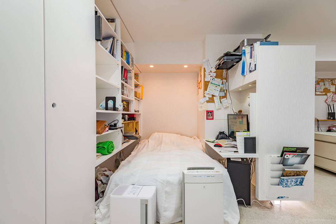 □コンセプト:【SOHO.形式で働く施主とペットが24時間共生し、ペットも快適に感じる空間創り】 マンションの旧リビングダイニングと旧和室を一室としながらベッドルームのプライバシー空間も作り出した。