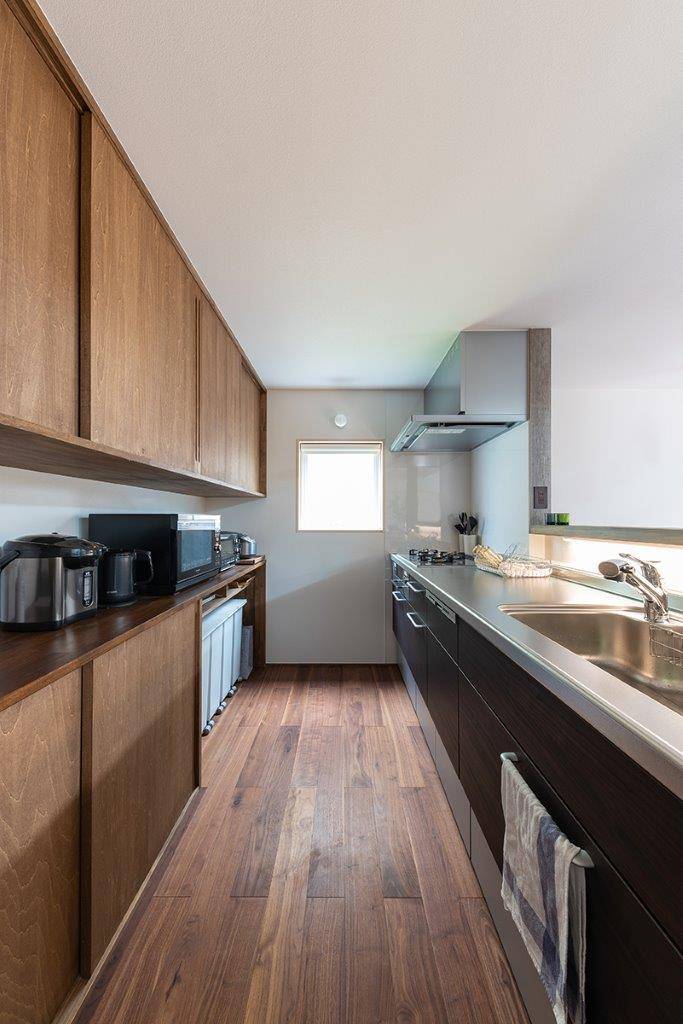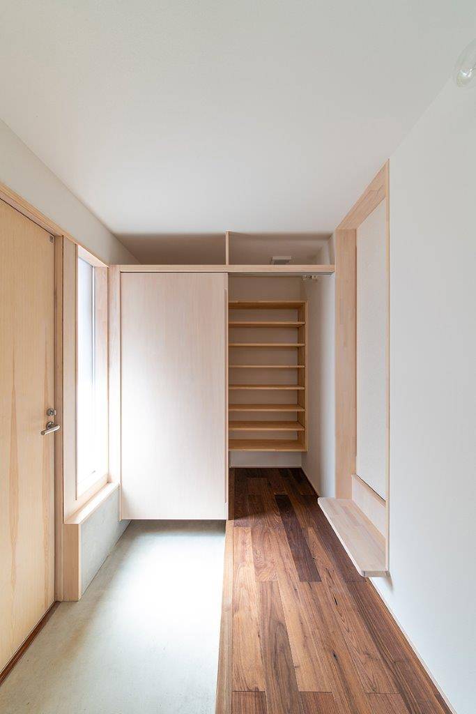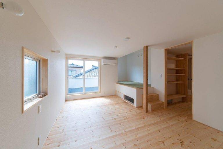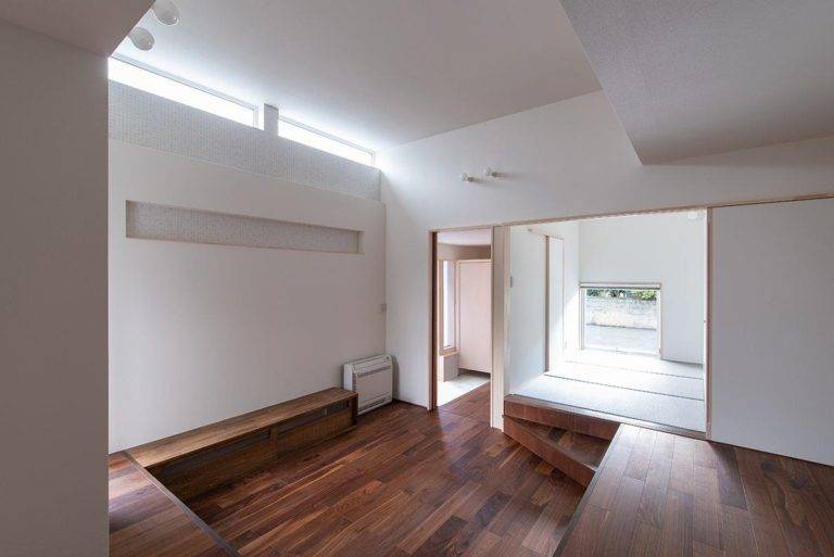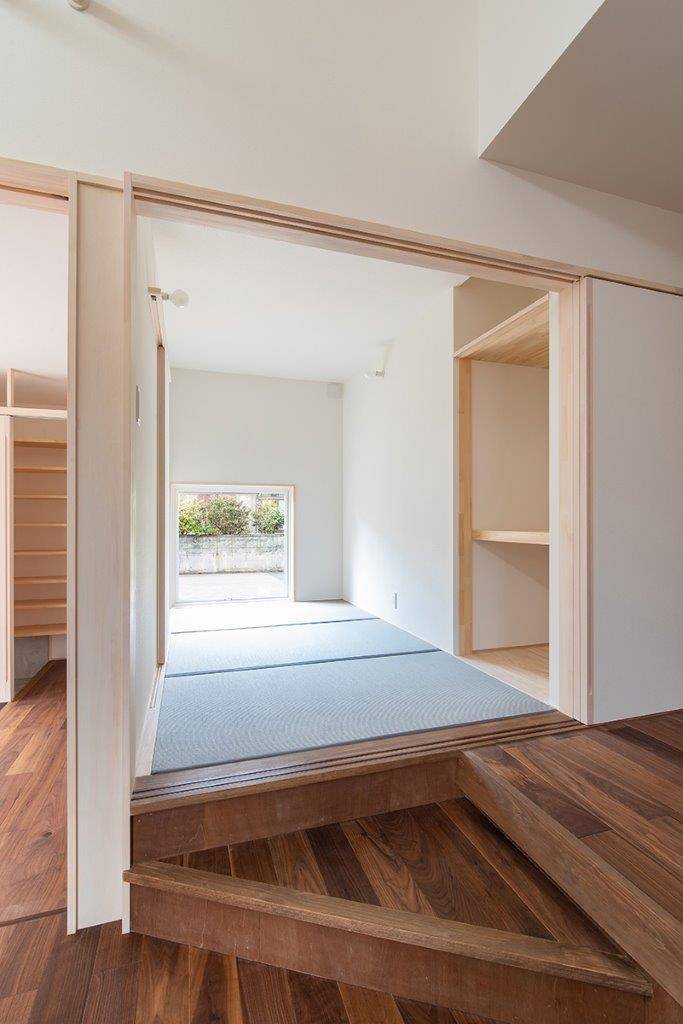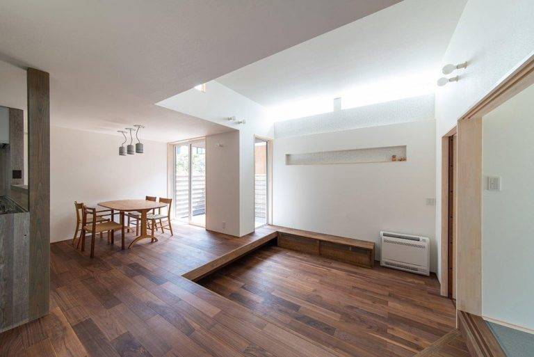 ダウンフロアリビングが特徴的な住まいです。三方が住宅に囲まれた密集地で、道路より敷地が約40㎝高くなっていました。その敷地の高低差を利用し、リビングの床の高さを低くしています。通常は、敷地が高い場合、玄関前のポーチ階段により、数段上がって家に入ります。荻曽根の家では、家の中で徐々に上がるようにしました。
