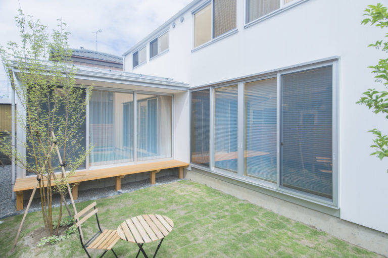 どの部屋からも庭を楽しめる、シンプルな空間構成です。