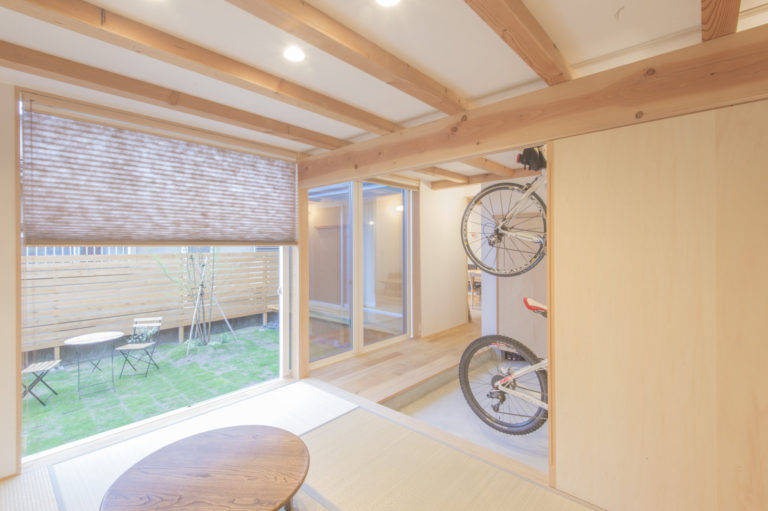 玄関は広々とした土間空間。ご主人の趣味の自転車整備も出来る、ゆったりとしたスペース。
