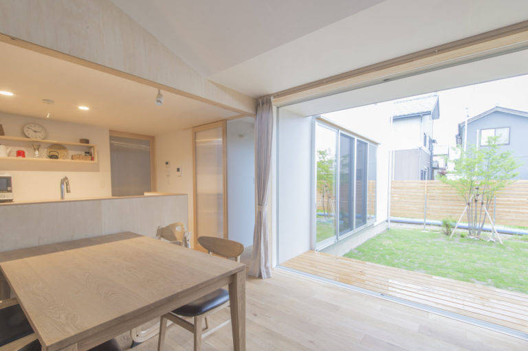 フルオープンのサッシにより、庭に開放されるリビングダイニング。