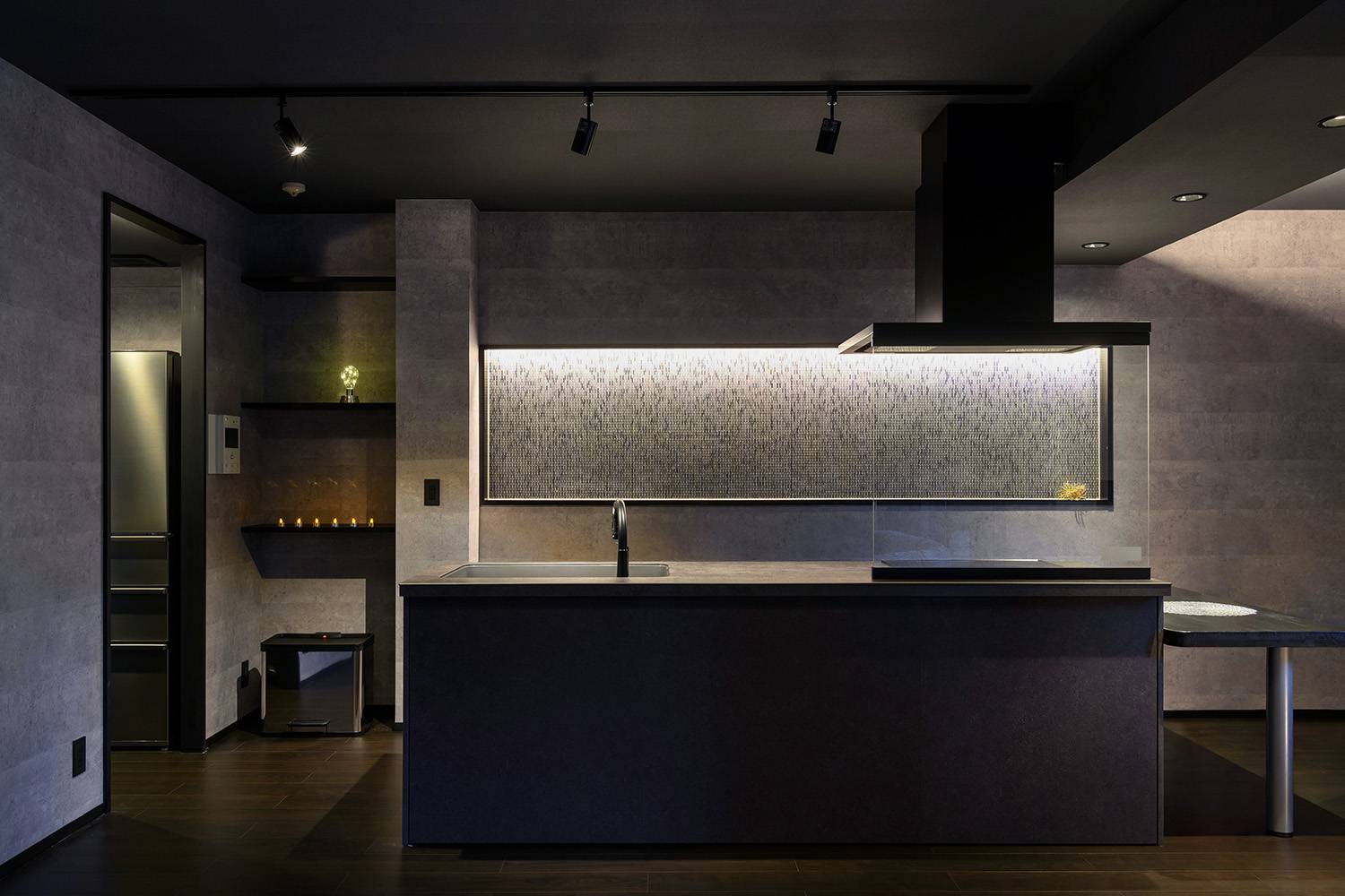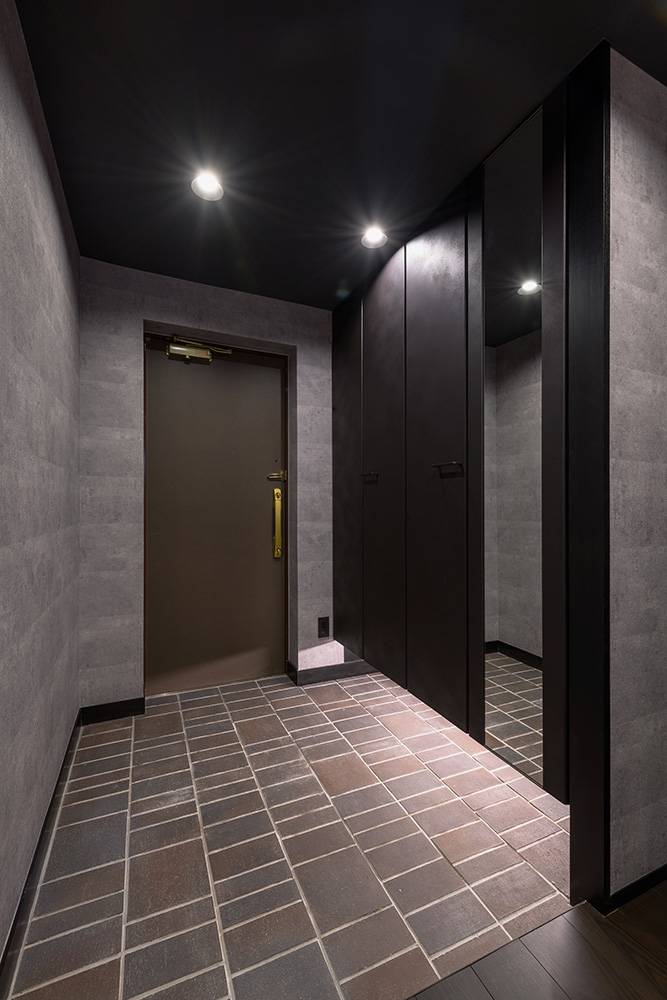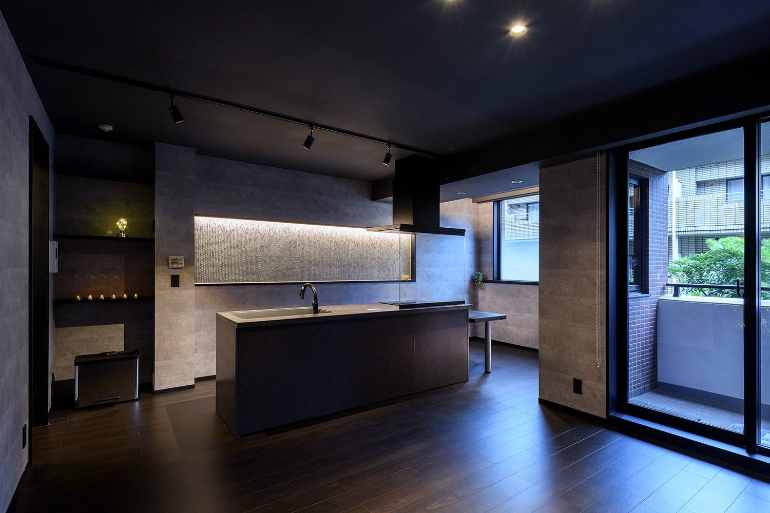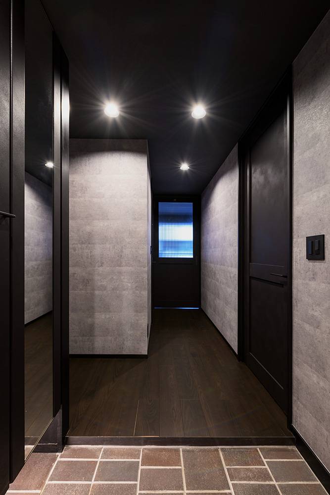 都市部にたつ集合住宅1住戸の改修工事(=リノベーション)。黒く・暗い部屋で静かに過ごしたいという要望を受け、床や天井、建具や家具など全て暗めのモノトーンな仕上となっている。 全体のバランスを考えて壁だけは少し明るめにしつつも、他に負けないコンクリート風の質感をもった仕上を採用し、照明もダウンライトや間接照明をメインとして、照明器具や光源が目につかず、落ち着いた静かな空間を演出している。 各室の形状をなるべくシンプルにすることで、まるでコンクリートを削りだしたようなハードで静謐な空間が出来上がった。
