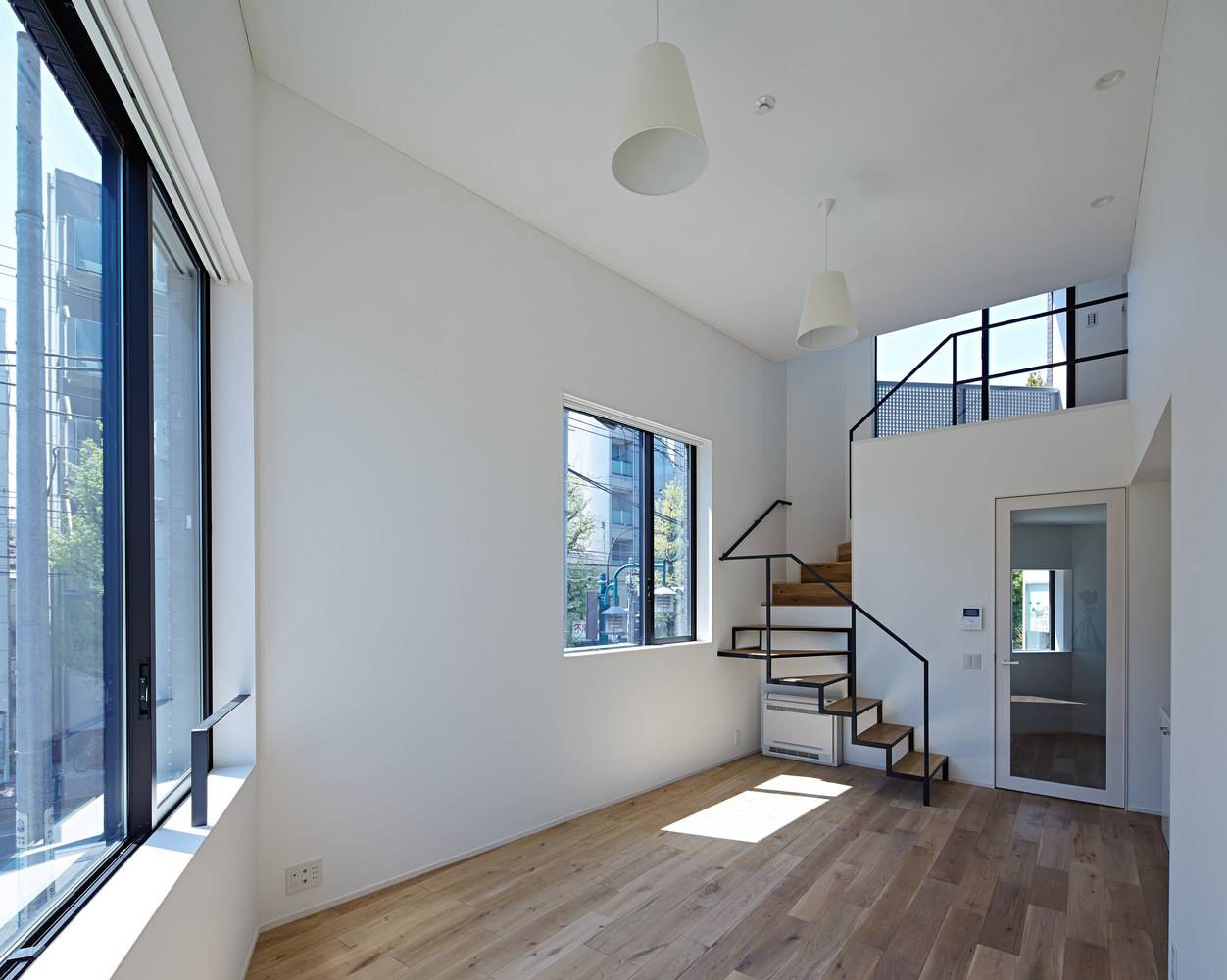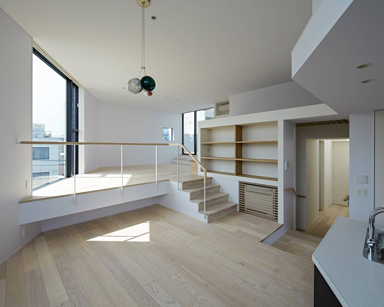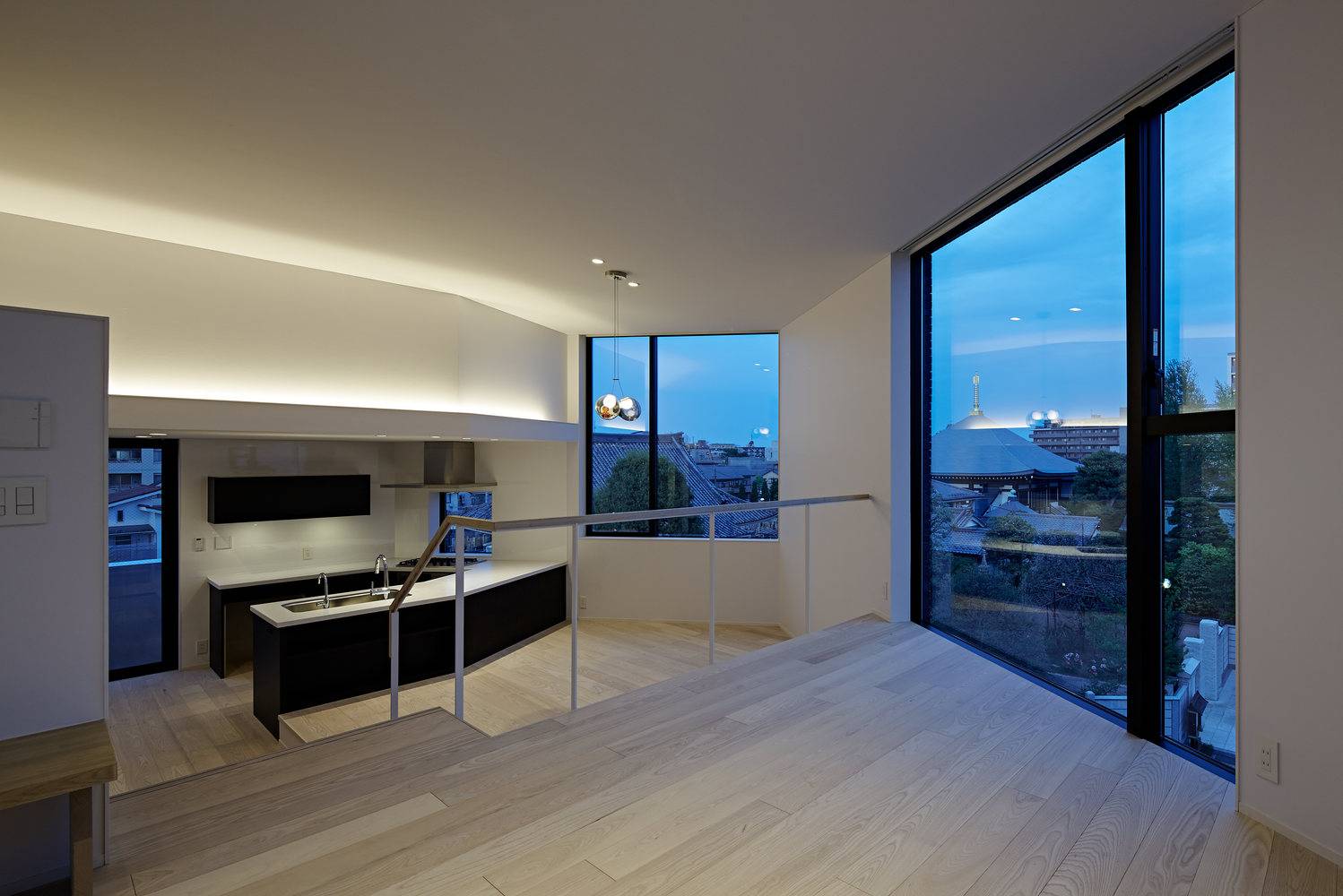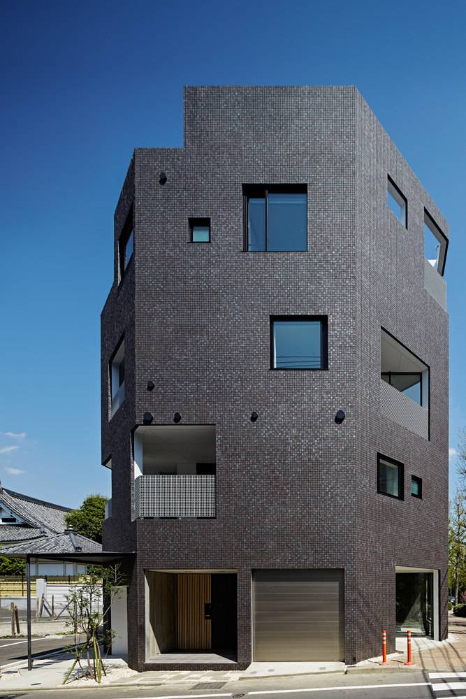 敷地形状の変更によって建替えをすることになり、まるで道路の中に建つような状況で、建物は全ての道路に正面となるような形状とし、また窓やバルコニーの開口も全面にランダムな配置で設けている。内部空間は螺旋状のスキップフロアとすることで平面的な広がりと周囲全面への眺望を確保した計画としている。