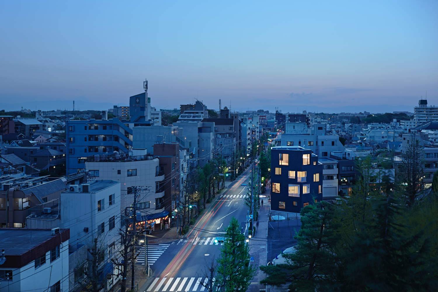世田谷通り沿いのちょっと変わった敷地に建つ集合住宅。計画敷地は元々は整形の角地だったのが計画道路(新しく敷設された道路)と隅切りにより削られ、ほぼ全面が道路に囲まれた6角形の変形敷地となっていた。