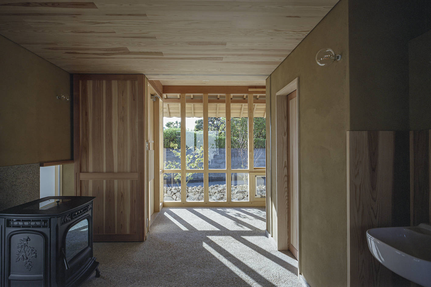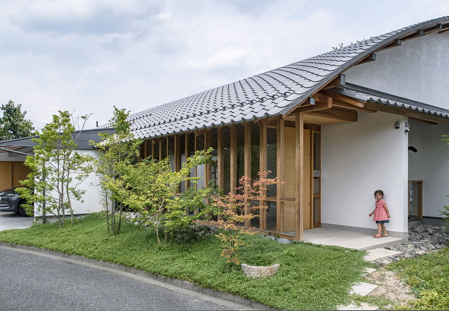 住まいは岡山県北部、出雲街道 勝間田宿の代官所跡に、敷地の選定から参加させて頂いた計画である。敷地西側の地元住民しか通らない狭い道路からのアプローチになる。大きな瓦屋根は道路に向かって勾配をとり、道路側の圧迫感を減少させ、大きく跳ね出した軒で夏の西日を遮蔽している。道路側に視覚的に開放した玄関土間は、生活空間との緩衝地帯になる。そこには、カーテンもブラインドも無く、少し狭い間隔に並んだ柱が、わずかに外からの視線を遮っている。