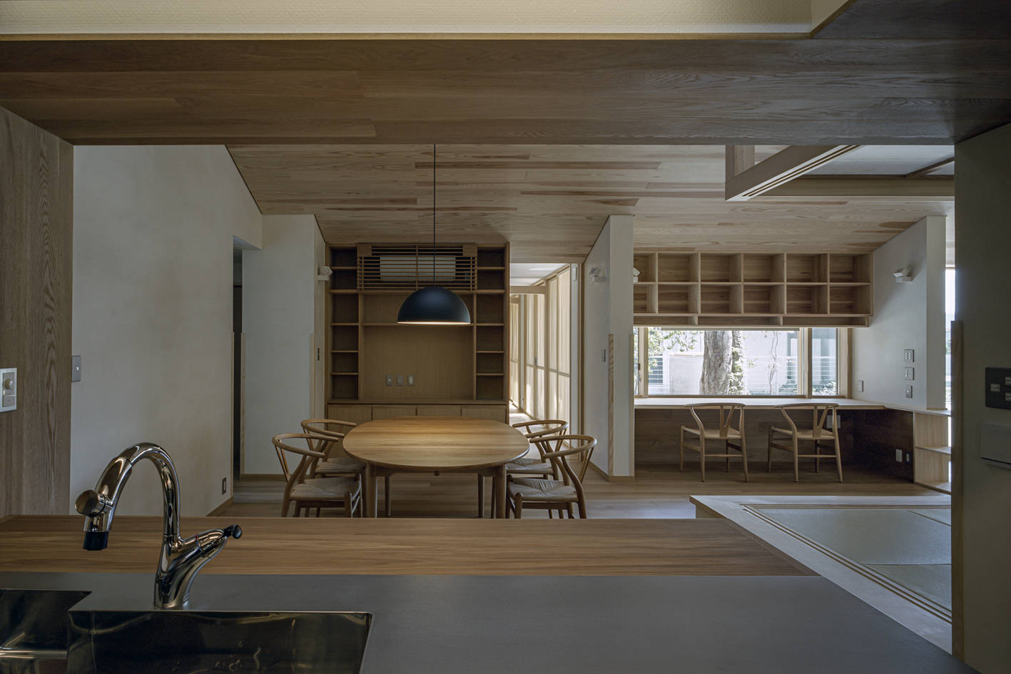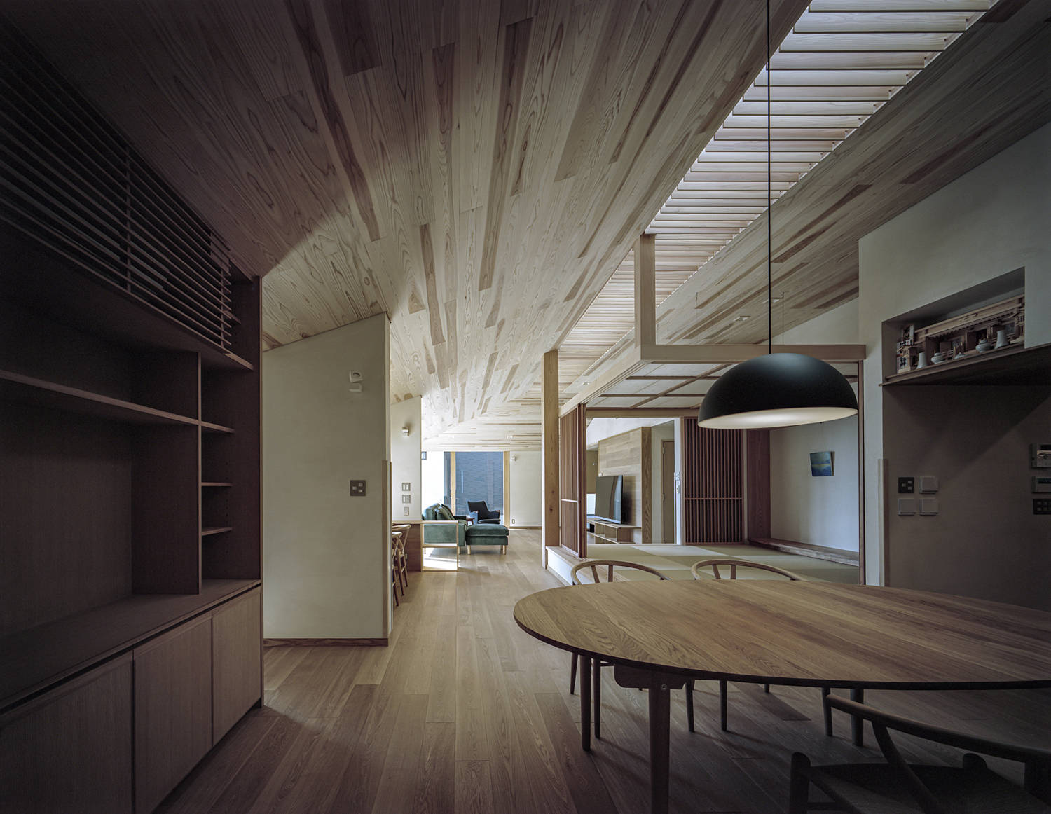 家族4人の生活は、「どこに居てもお互いが見える」ことが求められた。リビング・スタディーコーナー・畳室・ダイニング・キッチンが大きな一つの空間に連なり、その上部のハイサイドライトからルーバー天井を通して外光を取り込んでいる。