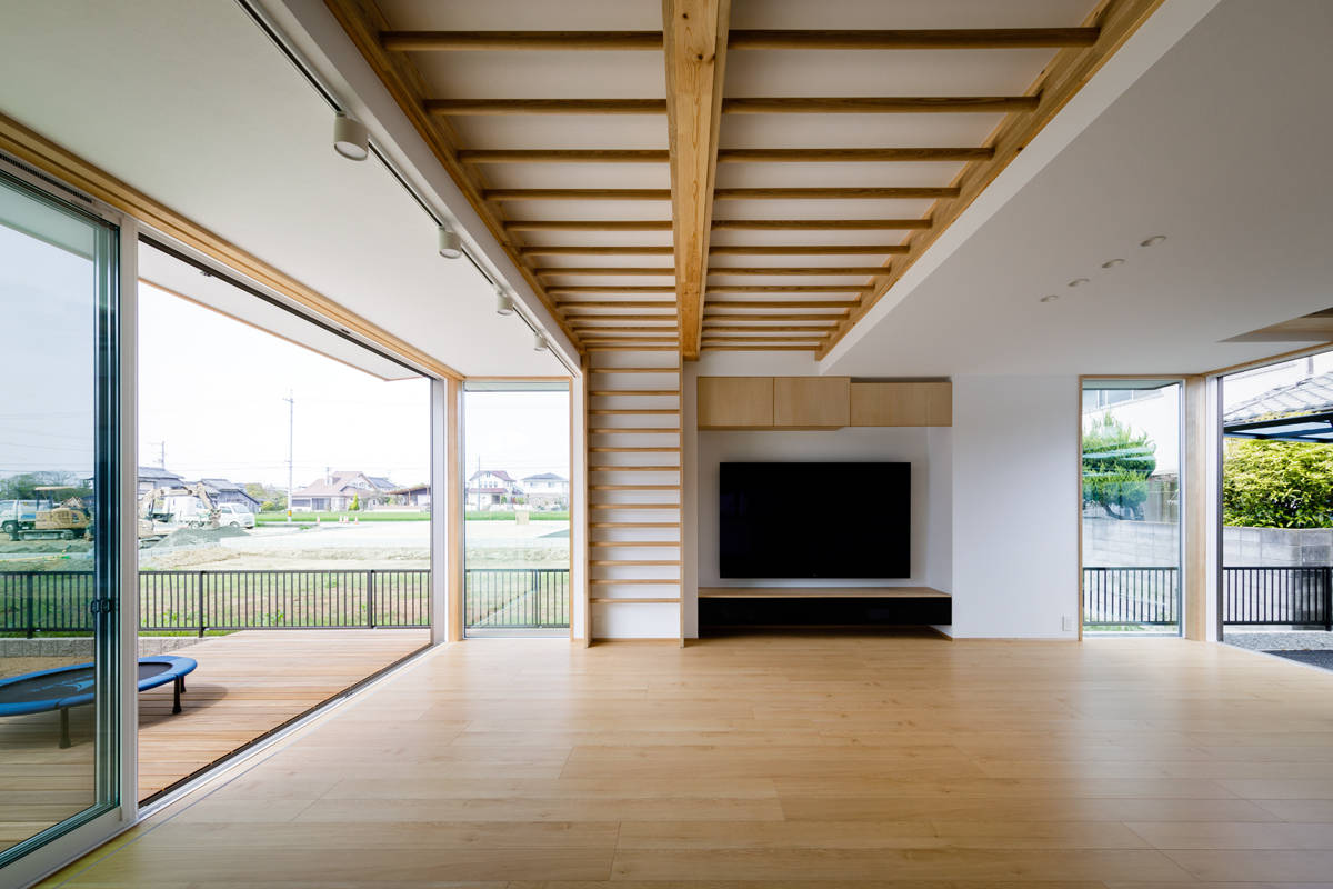南側開口部には4m幅の3枚引き違いのサッシを計画。