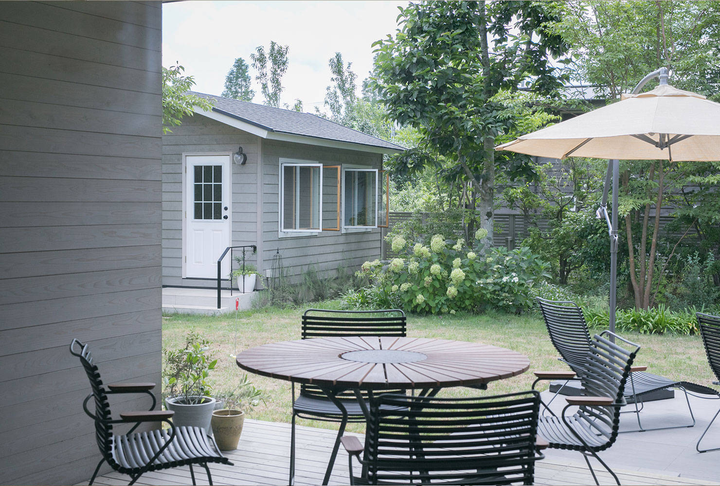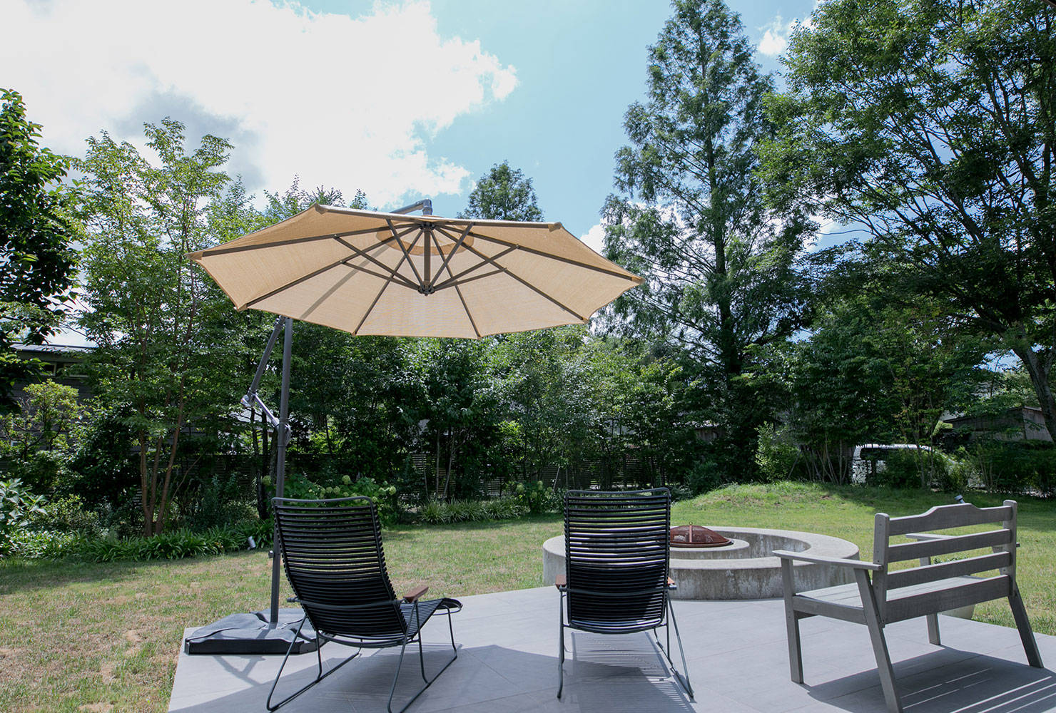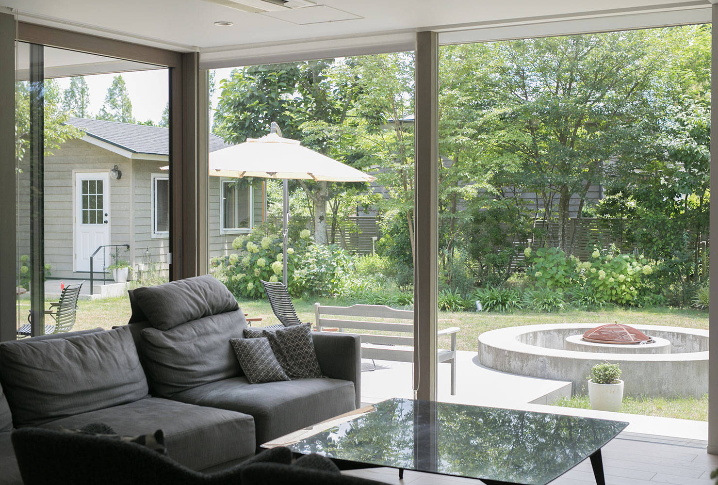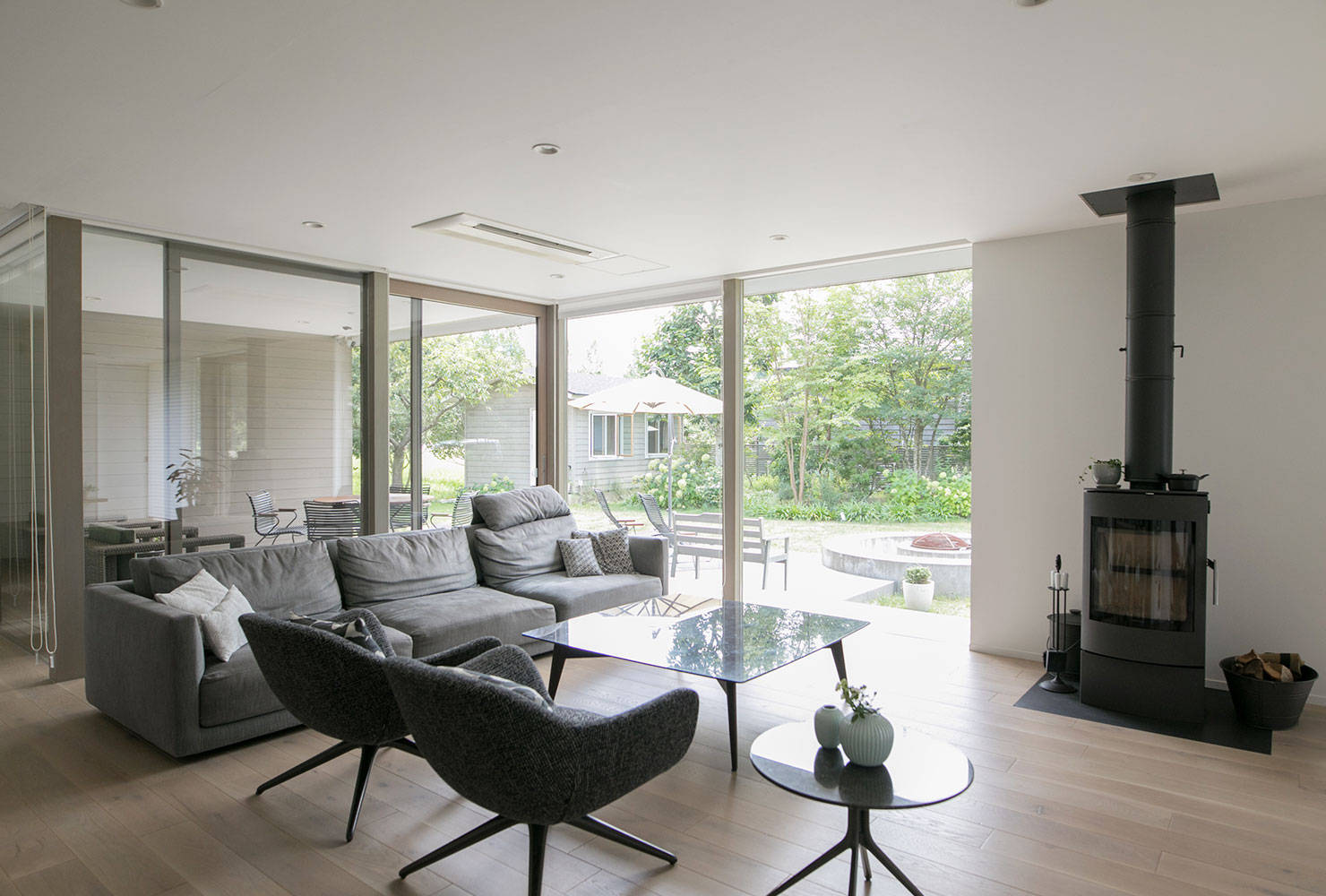 迎えてくれたのはSさんご夫妻。リビングに足を踏み入れると、一面のガラス窓から手入れの行き届いた庭が広がり、まるで緑の中に暮らしているような錯覚すら覚えます。アッシュグレイの床、黒い薪ストーブ、白い壁とやわらかな光を通すシェイド、グレイのソファ、アイアンのオブジェなど、外観同様グレイに統一され、シックで透明感のあるインテリアに目を奪われます。リビング脇には、ガラスの引き戸で室内からアクセスできるインナーテラス、そこから屋外テラスと焚き火ができるファイアーピットのある庭へとつながります。「自宅はここから車で30分。金曜の夜仕事が終わるとここへ移動して週末を過ごします。そして月曜の朝に直接職場へ向かう。ほぼ毎週です」とご主人。