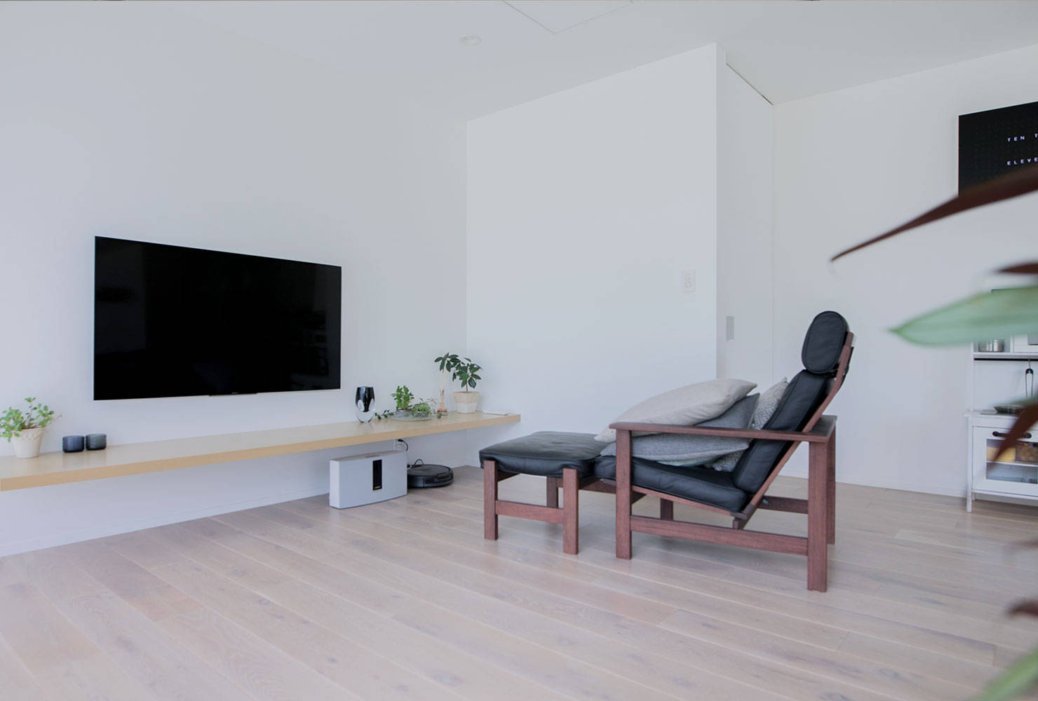 都内から東京湾アクアラインを経て車で1時間ほど。房総半島の緑眩しいキャンプサイトの一角にS邸はあります。木々に囲まれたアプローチから現れるのは、グレイッシュな色調と大きく水平に伸びた軒のシャープさがモダンな家。くっきりとした輪郭が印象的な平屋建ては、緑に包まれてそのスタイルの美しさがさらに際立ちます。