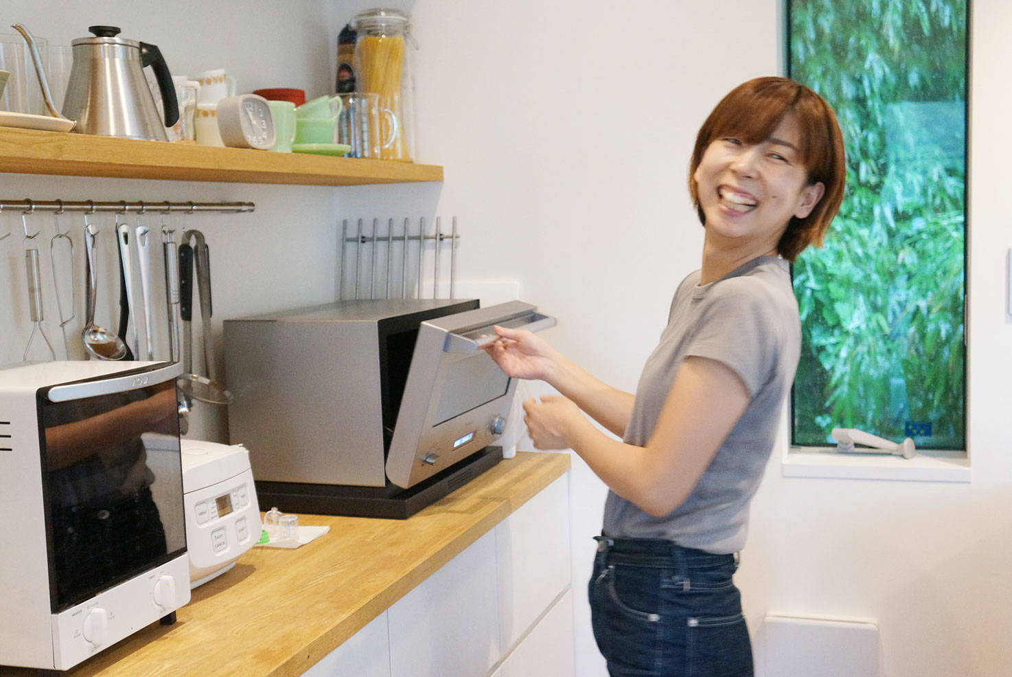 冷蔵庫はフレンチドアのAQUA。SANYOを買い取った中国メーカーで、デザインはスタイリッシュだけど余計な機能がなくて価格もリーズナブルです。冷蔵と冷凍だけのシンプル設計で大容量。子どもが小さいので、冷蔵庫が大きいと何かと助かります。食洗器はAEG。食洗器は業務用で、奥行きもあってめちゃめちゃいっぱいはいりますよ。日本のメーカーも見たけれど、やっぱり容量の大きさにこだわりました。IHもAEG。魚焼きグリルがついていないのが決め手。だって、使わないものはいりませんよね。フラットボタンがシンプルで家電っぽくないでしょ? あと、レンジはバルミューダ。余計なものを省き、必要な機能だけ手に入れる。引き算で選んだ家電ばかりです。