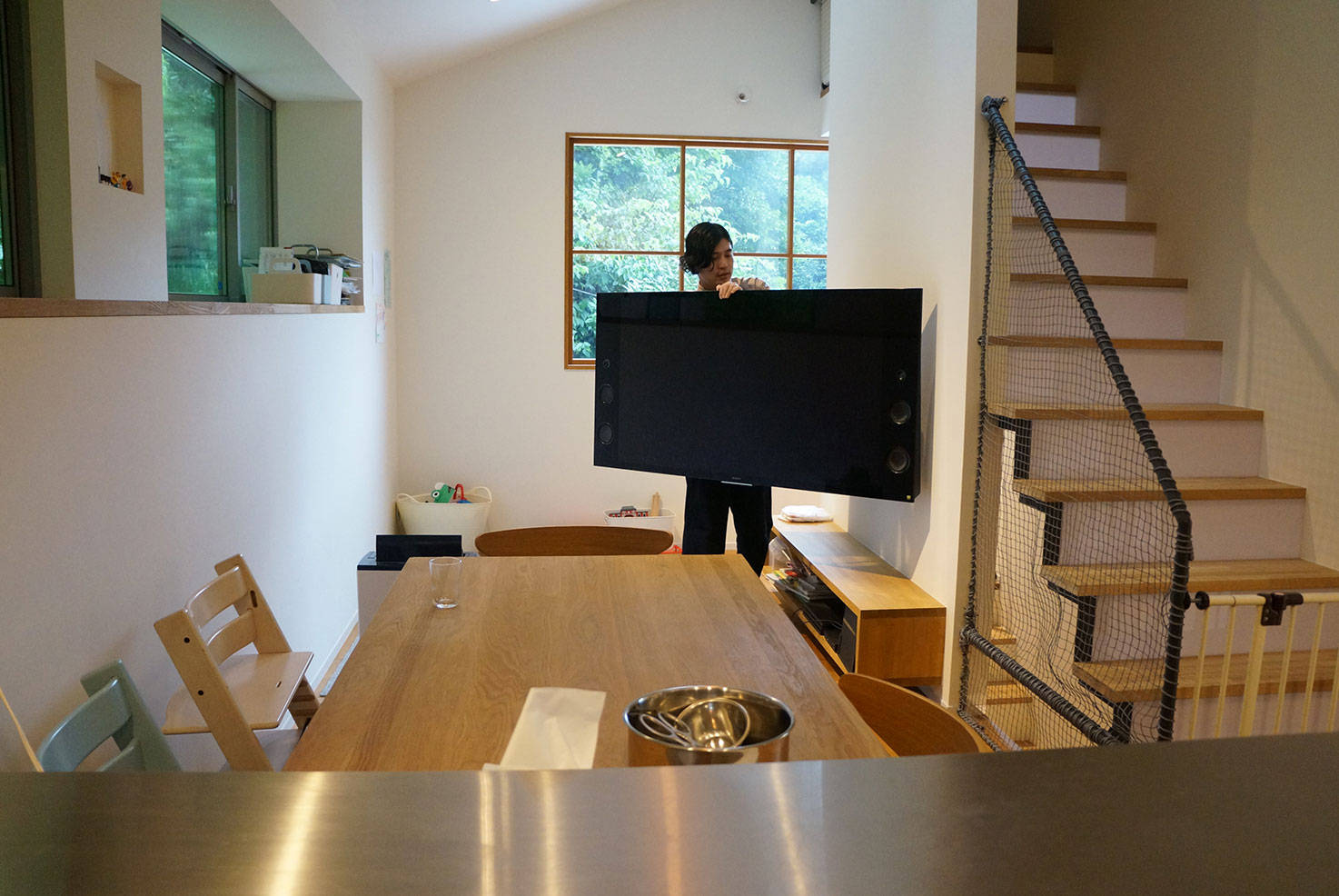 TVが大好き!という奥様の為、壁付のTVはアーム付き。角度は変幻自在。お料理中でも好きなTVが見られます。