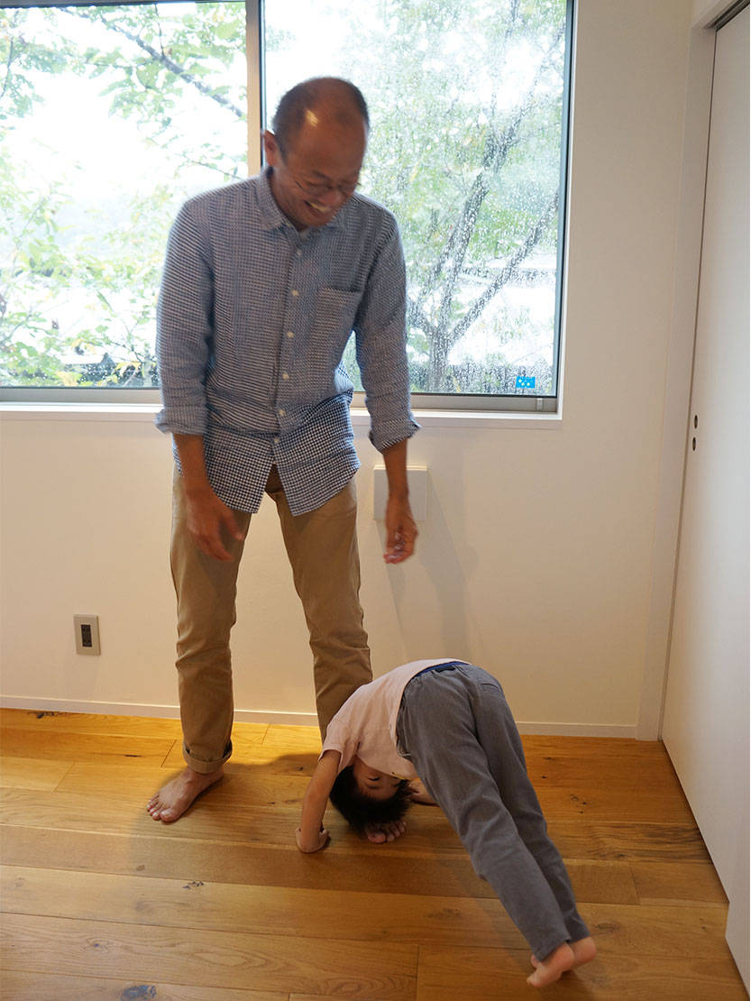 高橋さん:「ここは、水はけの悪さ、高い湿度、山のような枯れ葉と、かなり過酷な環境。でもそれ以上にいい部分があった。2階からの抜けた眺めと豊かな緑の環境をどう生かすかと、寺坂さん一家がここでどう暮らしていくのかを考えながら設計しました」。