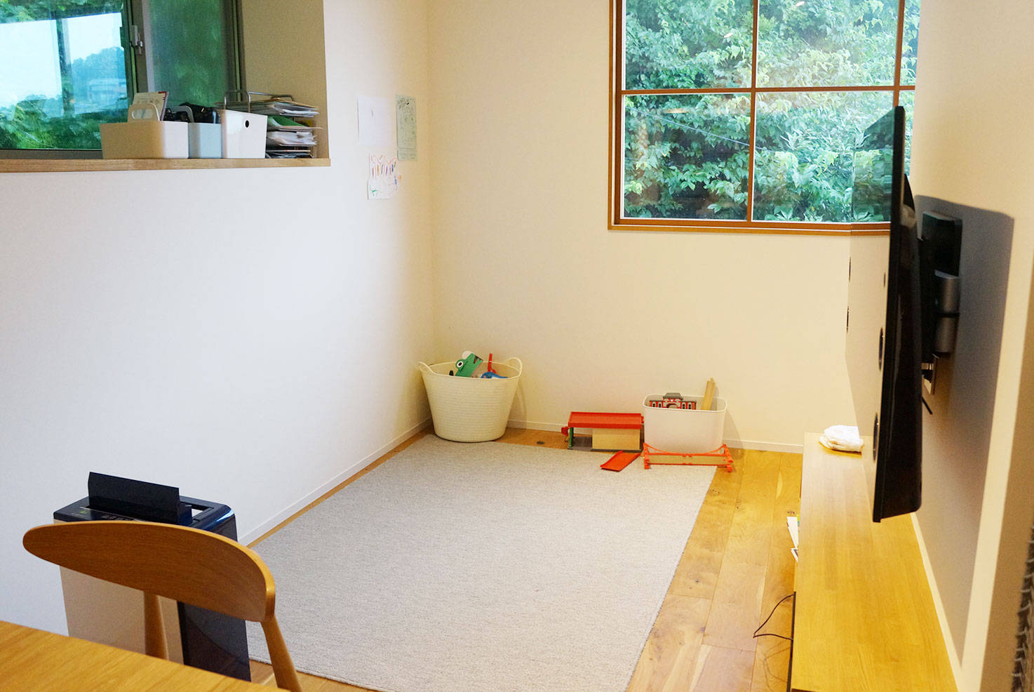 住居は2階の1LDKとロフト。開放的な吹き抜け、白い壁とやわらかな無垢の床。子どもたちの様子をみながら料理が作れるようにと、奥様の志帆さんの要望でオーダーした広々としたオープンキッチン。いくつもの窓からは鎌倉の空と家々の屋根、そして豊かな緑といった清々しい景色が広がります。LDK隣にある寝室兼プレイルームの窓の外には、隣家との間に山桜と梅と紅葉が一列に並び、季節ごとに目を楽しませてくれるのだとか。「お隣も植物がお好きで、一緒に育てようねって話してます(笑)。ご近所は素敵な人ばかりですよ」と寺坂さん。