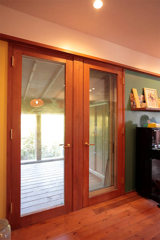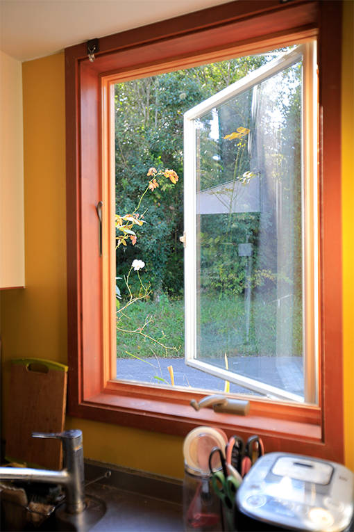 木の温もりが満ちる屋内に足を踏み入れると、カラフルな5色に塗られたLDKの壁、そしてリビングから緑の庭へ抜けていく爽快な眺めに目を奪われます。黄色に塗られたキッチンの窓には、アメリカから取り寄せたアンダーセンの木枠の窓。「キッチンの窓からこの景色が眺められるように」と奥様がこだわった窓は、周囲の緑を美しく切り取ります。そのほかにも、キッチン脇の木の開き戸、ウッドシャッター、竹の照明シェード、寝室の畳など、数え始めればこだわりは尽きることがありません。庭には、ハーブ畑も作られ、そこかしこからKさん一家が満足して暮らしている姿がうかがえます。