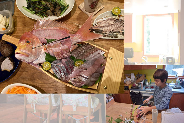 特に、いすみ市に越してきてから長男くんは興味を持つものが自然と変わっていったと言います。東京にいる時は本を読んだりするのがメインで、知識としての勉強が多かったのですが、いすみに来てから本物の生き物や自然と出会い、体験に変わりました。今は道の駅で安く売られている新鮮な魚を買っては捌くのが面白いと言います。「最近じゃ友人が魚を持ってきてくれて、それをさばくのが長男の趣味です。お寿司も握ってくれるんですよ! ここの友人たちがハーブのこと、庭のこと、ウッドデッキを作ってくれる大工さんのことも教えてくれて、生活すべてが人とのつながりでできてるんじゃないかな。どんどん世界が広がっていく。最高です」。