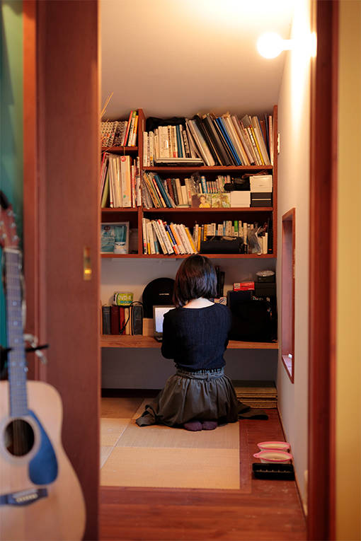 Kさん家族が命名した『籠もり部屋(こもりべや)』。窓や棚位置を低めにして、なんとなく一人で籠りたい時、ホッとする空間になるように設計されている。あまりの居心地の良さで仕事の集中効果が高く、家族で争奪戦が起きることも(笑)