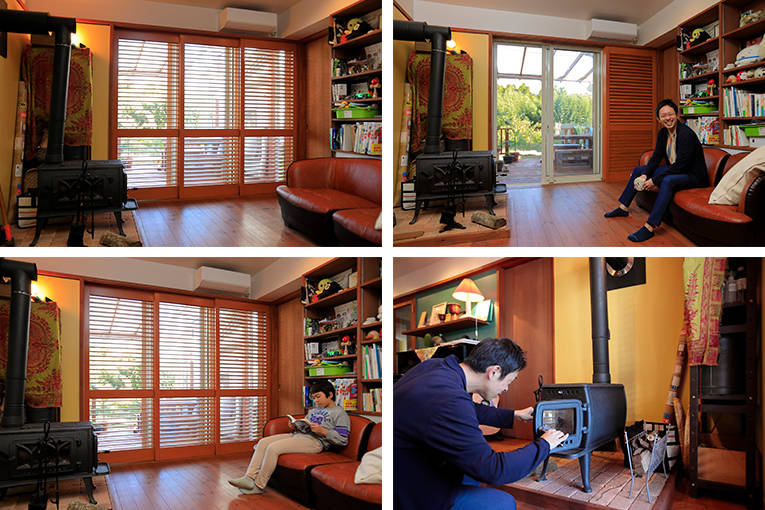 薪ストーブです! ほんとにいいです。まず、暖かさが心地いい。電気を使った暖房機とは全く違う暖まり具合なんです。暖かさがだんだん体に染みてくるというか、全身がぽかぽかしてきます。あとは、炎を眺める心地よさ。炎がなんともいえない色に変わって、青くなったり赤くなったり。それに想像もできないような動きをするので、いつまでも眺めていられます。火はほんとうに美しい。その表情に魅せられています。燃えるときの音もいいんですよね。(ご主人)