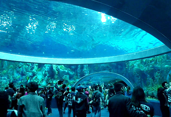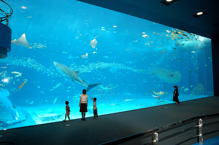 また、縦横数十メートルという巨大水槽の全面窓は1枚で作られているように見えますが、実はこれもまた何枚かをつなぎあわせており、特殊な接着剤に加えて、つなぎ目を磨きあげる技術の秀逸さによって、肉眼ではつなぎ目が判別できないほど精緻に作られています。