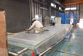 強烈な水圧を受け止める巨大水槽は、アクリル板を何枚も接着して重ねることで強度を確保します。