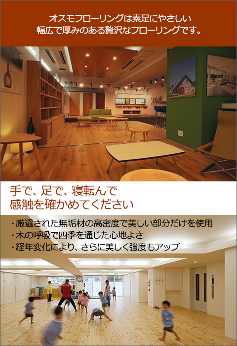 写真(上):名古屋ショールームのフローリング写真(下):オスモカラーやフローリングはその高い安全性・耐久性から幼稚園や保育園に多く採用されています。