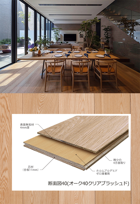 「複合フローリング20シリーズと40シリーズは、根強い人気を誇る商品です。特に、4㎜厚の単板を貼った40シリーズは、180㎜の幅広で、無垢に近い質感が楽しめると好評です」と代表取締役の津田龍太郎さん。