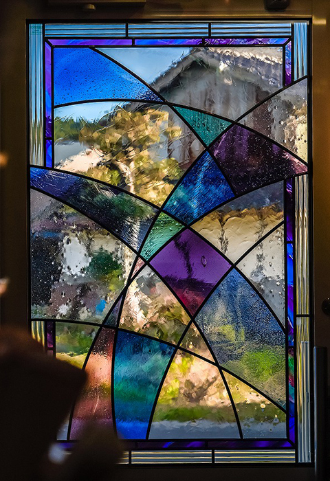 赤色一つにしてもガラスを重ねて微妙な色合いを演出するなど、ステンドグラスの奥深い魅力にも触れ、「我が家は窓外にある山を借景にしているので活かしてほしい」とだけ依頼してプランニングをお任せしたところ、素晴らしいサンプルを作って頂き、即決しました。