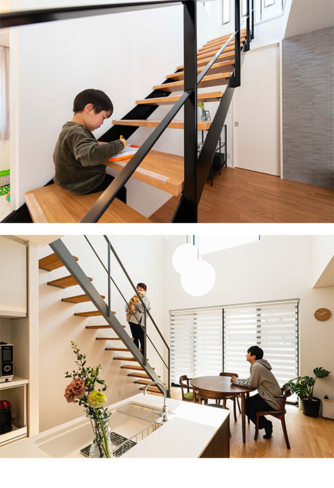 たとえば、光の差し込むリビングの階段に腰かけて、本を読む。階段は、時々子どものお気に入りのお絵かきテーブルになる。猫は階段での運動が大好き。階段下は隠れ家みたいで、子どもの遊び場や書斎にうってつけ。階段を上り下りする家族の気配が、ほんのりと伝わってくる安心感。シースルー階段は暮らしにさまざまな色彩を与えてくれます。