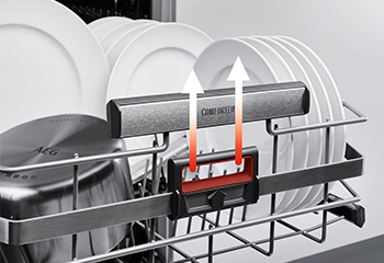 ComfortLift®は、下段のバスケットを片手で上段の高さまで楽に持ち上げられる仕様で、腰をかがめずに食器の出し入れができます。特許も取得しており、ユーザーの使いやすさを追求したとても便利な機能です(山本さん)」