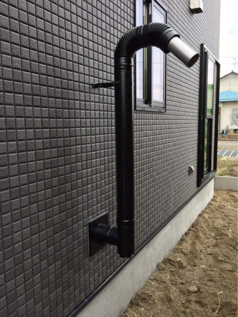 CF式である薪ストーブは、煙突を高く立上げて上昇気流によるドラフト効果を利用して室外へ排出するので、屋根上からもくもくと煙が出ているのを見たことがある方も多いと思います。しかし、FF・FE式ペレットストーブは二重排気筒を壁から貫通させる程度の施工で、はじめの燃焼直後こそはペレットが燻られて白い煙が発生しますが、本燃焼に入ると煙は見えなくなります。