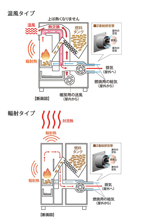 乾燥した木材を細粉し、圧力をかけて直径6~8mm、長さ5~40mmの円筒形に圧縮成型した木質燃料「木質ペレット」を使う暖房機です。