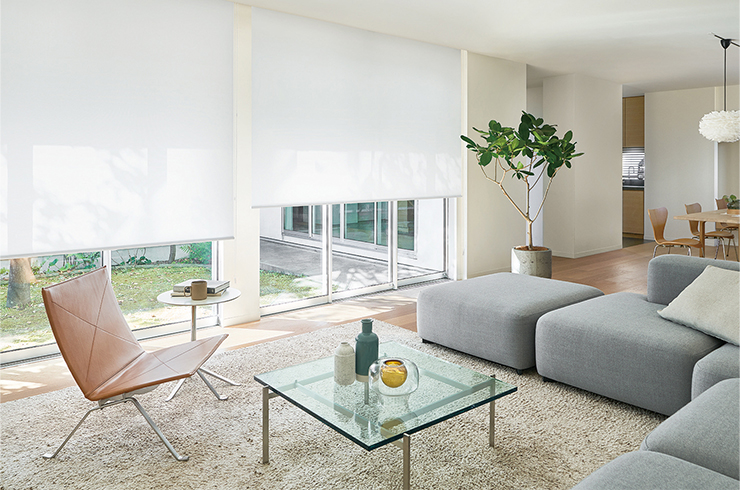 なかでもブラインドやロールスクリーンは、機能的でスッキリした見た目や、フルオープンにした時の納まりがコンパクトなことから、空間設計の魅力を味わうような住宅にうってつけ。シンプルモダンな作風の住宅で多用されていることにも、その特長がよく表れています。
