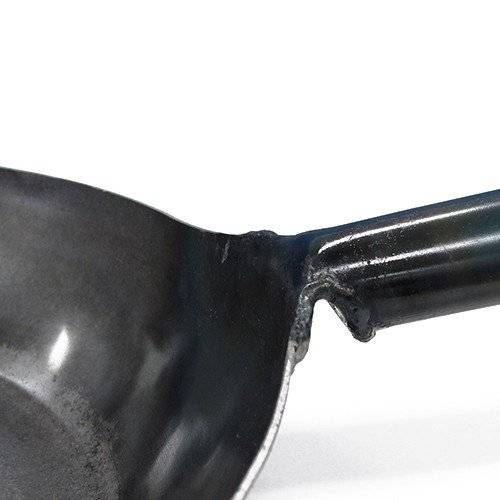鉄板は1.6mmと重くなく薄すぎない絶妙の厚さで、丈夫さと取りまわしやすい作業性を兼ね備えます。調理面と一体に溶接された柄は、細く楕円に丸められ手になじみやすく、細部にも使い手への心づかいが感じられます。