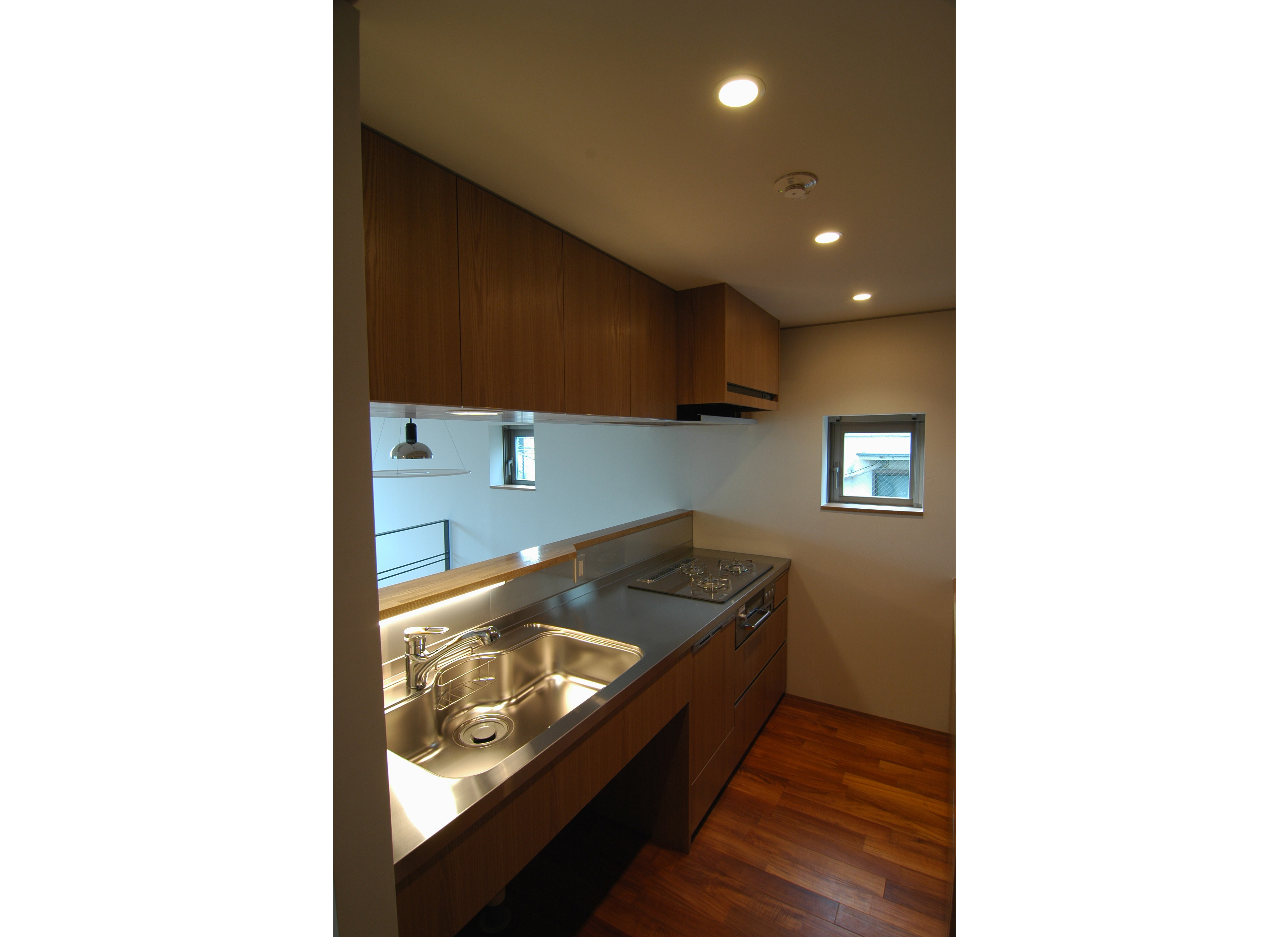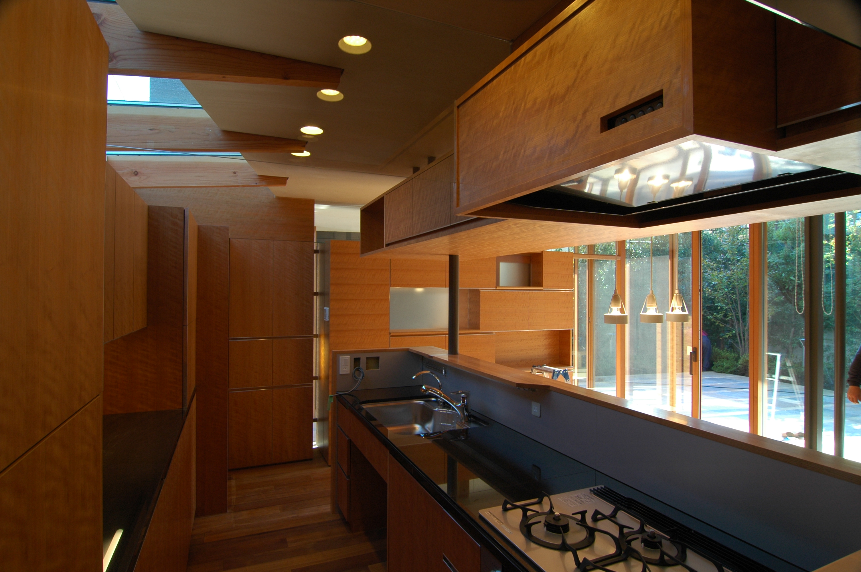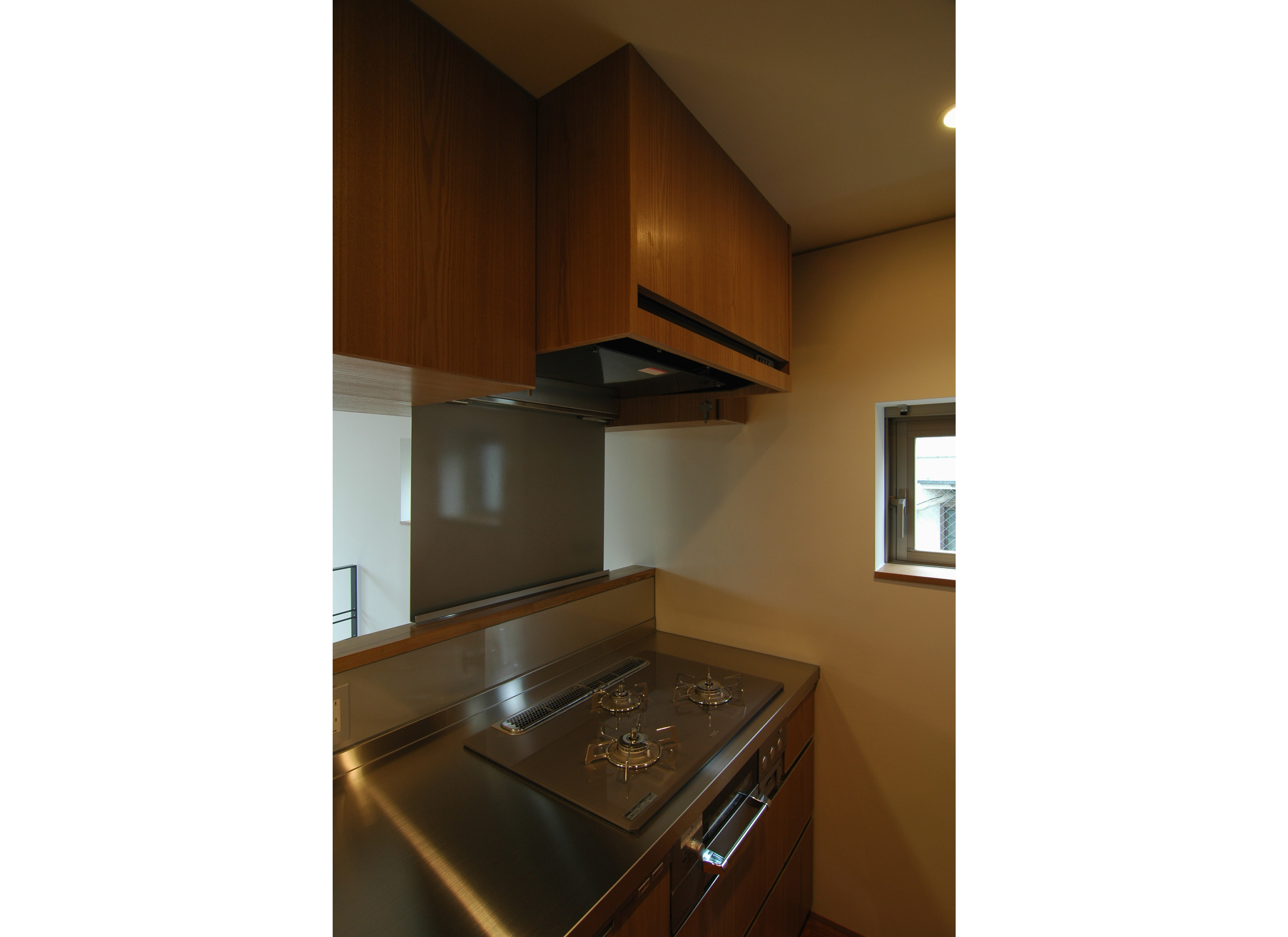 調理時はコンロの前には壁がある方が安心、でも普段は視界が開けていてほしい。一つの解決方法としては強化ガラスなどのクリアなガラスパネルをコンロの前に設置するというものがあります。ただこの場合は汚れが目立ちやすく、かなりこまめな手入れが必要です。そこで使用時だけレンジフードからおりてくる収納式のアルミの壁を考えました。コンロ使用時以外は、油が飛ぶ面が見えない向きにレンジフードに収納されるので、ガラスほどマメな手入れも必要ありません。