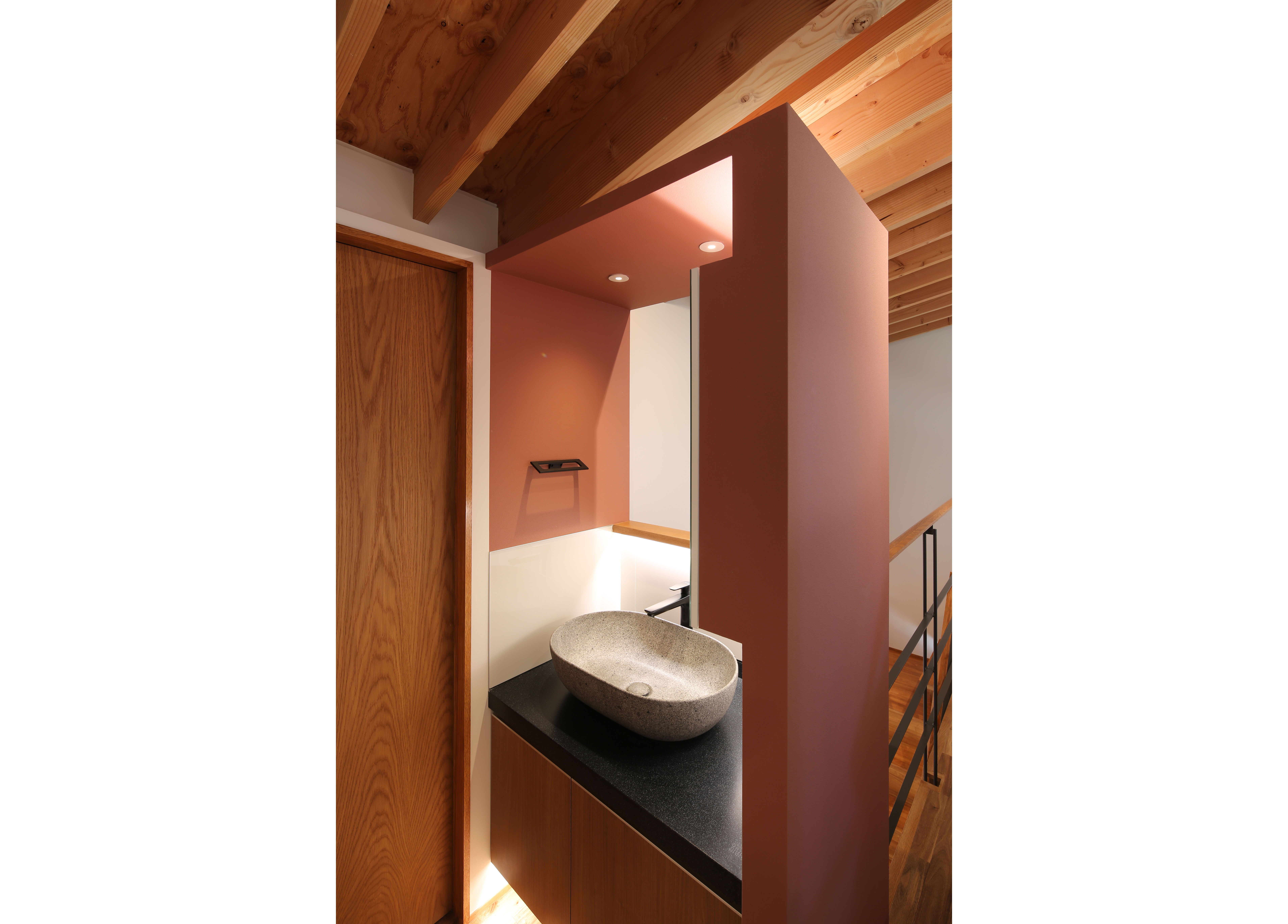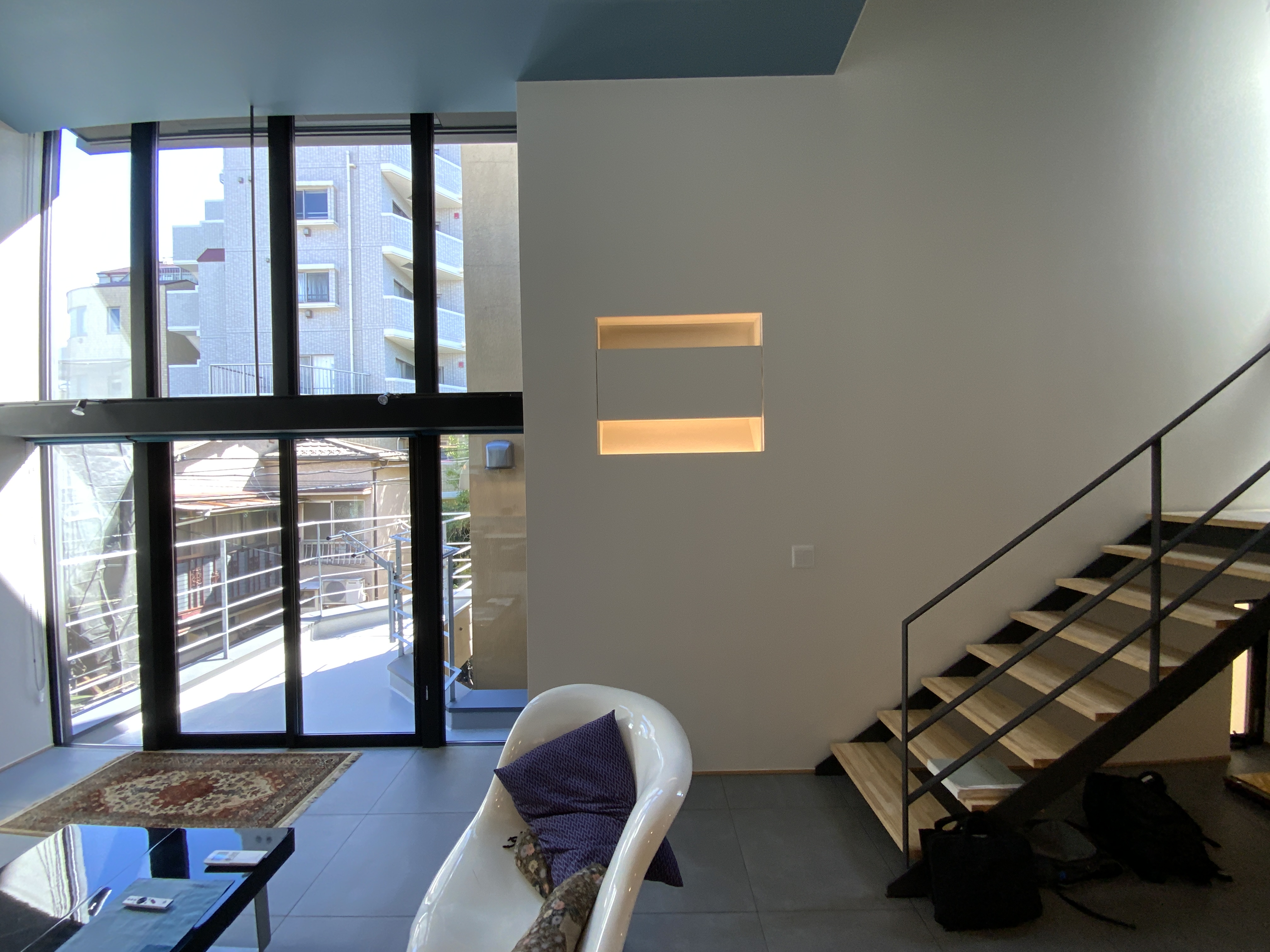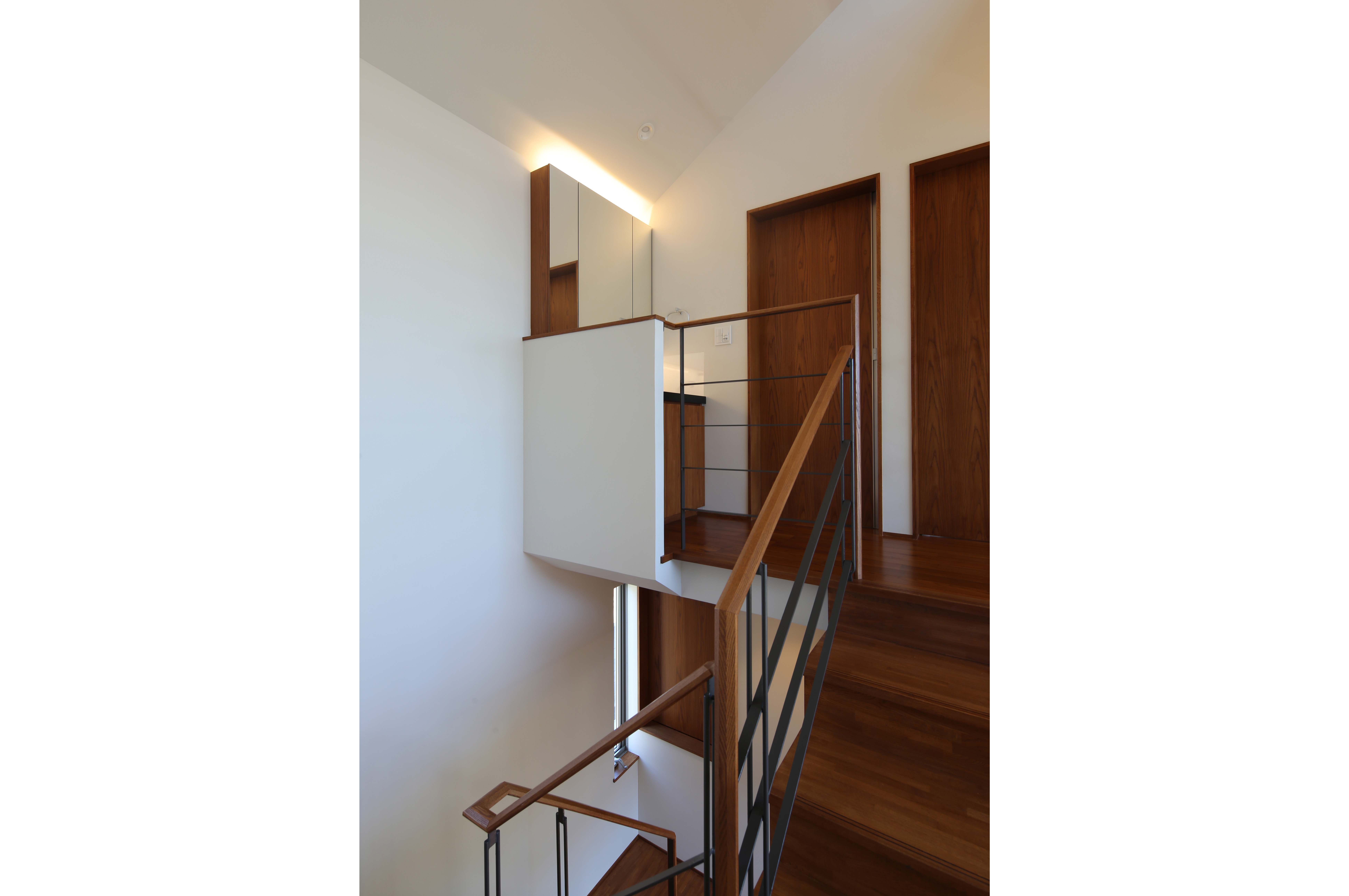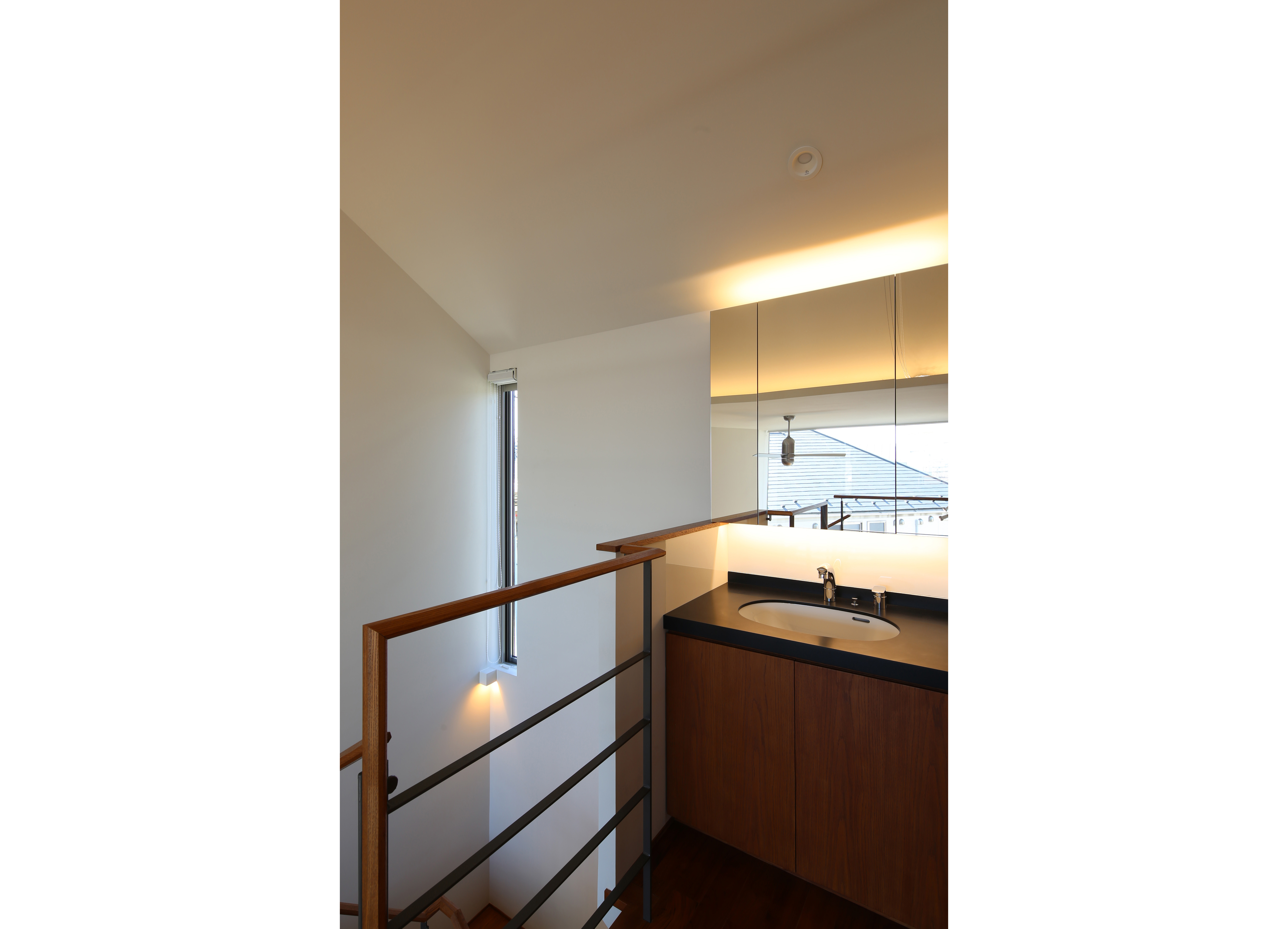調理時はコンロの前には壁がある方が安心、でも普段は視界が開けていてほしい。一つの解決方法としては強化ガラスなどのクリアなガラスパネルをコンロの前に設置するというものがあります。ただこの場合は汚れが目立ちやすく、かなりこまめな手入れが必要です。そこで使用時だけレンジフードからおりてくる収納式のアルミの壁を考えました。コンロ使用時以外は、油が飛ぶ面が見えない向きにレンジフードに収納されるので、ガラスほどマメな手入れも必要ありません。