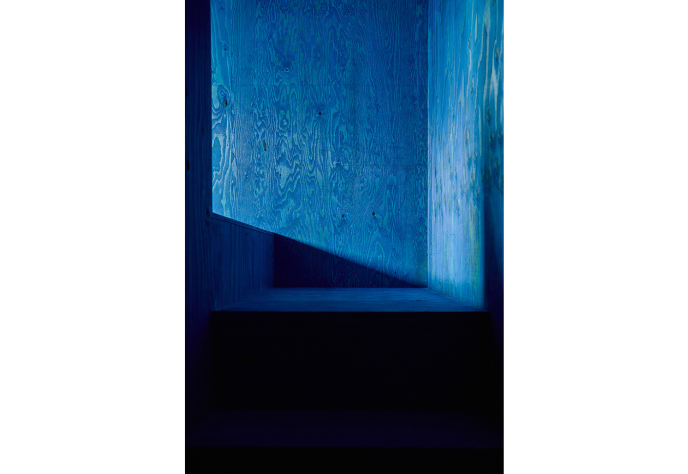 壁には、もともとの土壁を補修するために一般的な構造用合板を貼り、下部には段差を設け、ベッドボードのように仕立てています。ここに青い塗装を施すことで、木目が波のような独特の風合いを持ち、鮮やかな青と相まって、インパクトと美しさが増します。昔からの竿縁天井とのバランスも絶妙です。