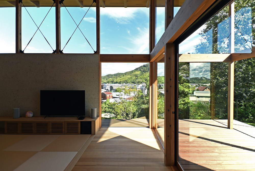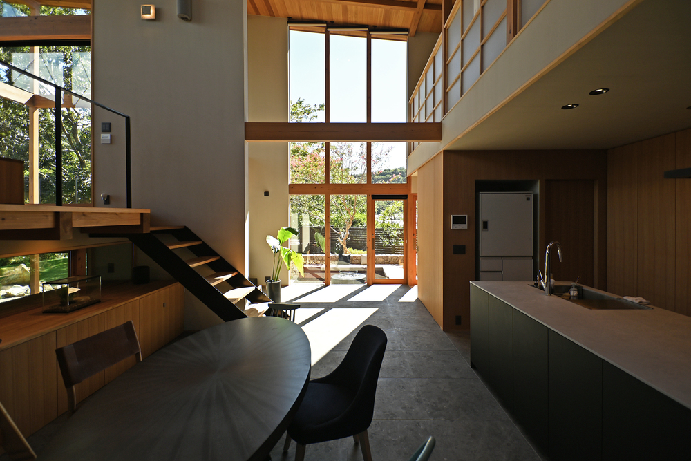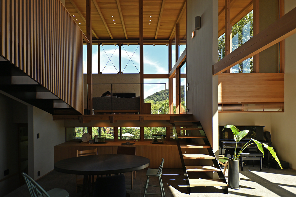 設計のポイントは、見せたい部分と隠したい部分のメリハリをつけること。ダイナミックに開く窓と居場所となる壁を組み合わせることで、周囲の自然を取り込みながら、落ち着ける空間を確保。駅近にも関わらず、まるで別荘地にいるかのような心地よさです。
