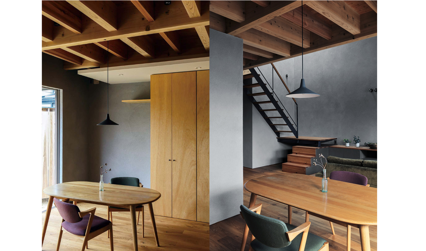 壁に採用したグレーカラーは木材や家具の色合いを引き立て、空間全体を落ち着いた雰囲気にしてくれます。左官職人の丁寧な仕事により、絶妙なムラ感に仕上がった壁は、日の光を柔らかく、優しい印象へと変えてくれます。