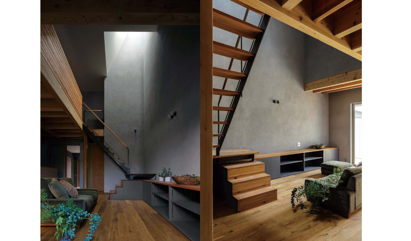 夜になると、照明が梁や壁の凹凸を照らし、明るい部分と暗い部分が生まれ、立体感のある空間に。昼と夜で異なる表情を見せるリビングは、住む人にとって特別な時間を演出してくれます。